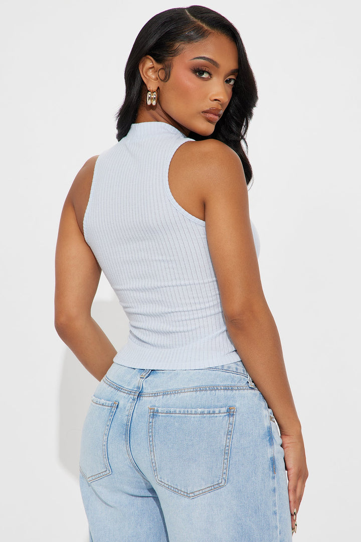 Available In Black, Blue, Cream, Ivory And Olive. | Rib Tank | Mock Neck | Stretch | Imported | 67% Polyester 31% Rayon 2% Spandex