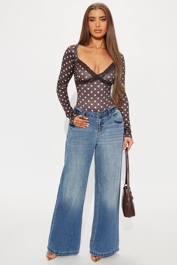 Available In Brown/combo. | Bodysuit | V-Neck | Long Sleeve | Lace Trim | Polka Dot | Cheeky Bottom | Snap Closure | Stretch | Self: 95% Polyester 5% Spandex | Final Sale | Imported