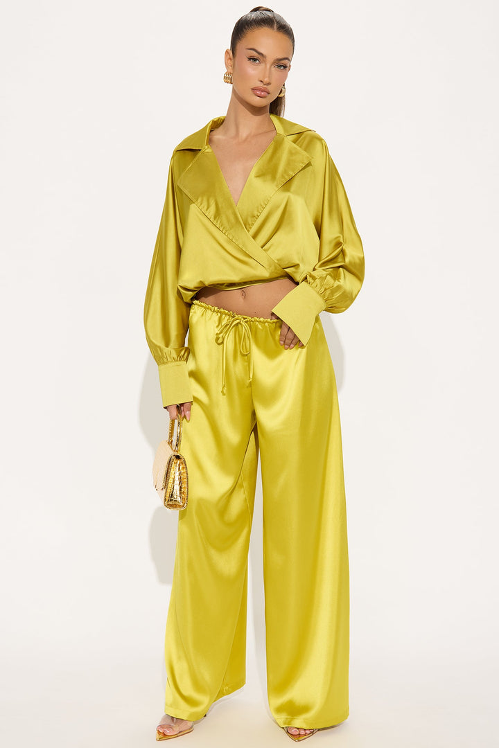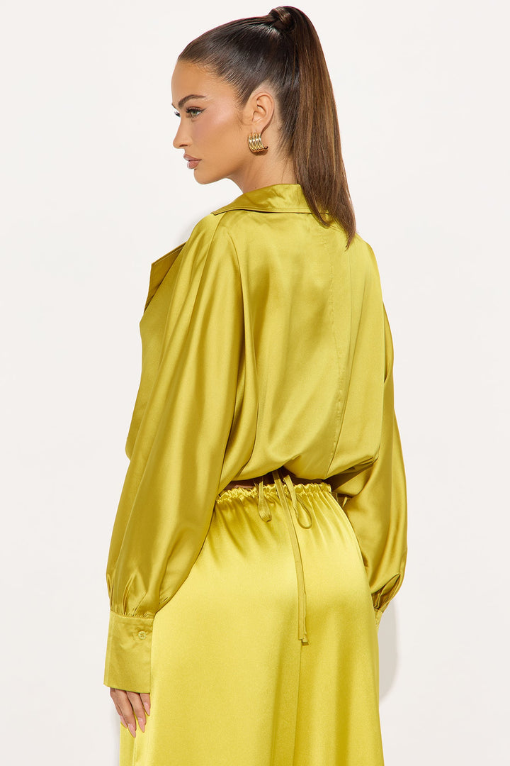 Available In Black And Chartreuse. | Blouse | Collar | Long Sleeve | Satin | Front Tie Detail | Non Stretch | Self : 95% Polyester 5% Spandex | Imported