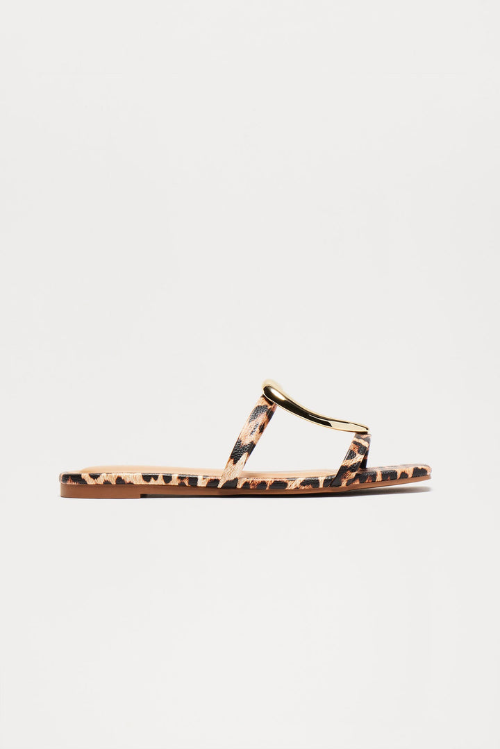 Available In Gold And Leopard. | Flat Sandals | Hardware Detail | Square Toe | Flat Heel | Imported