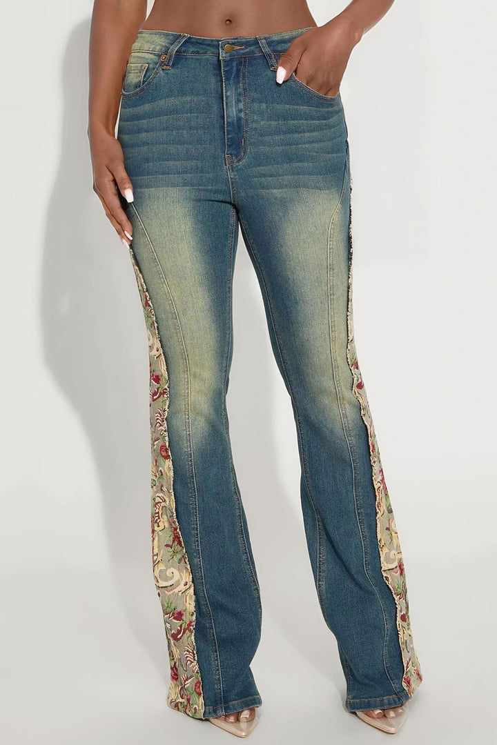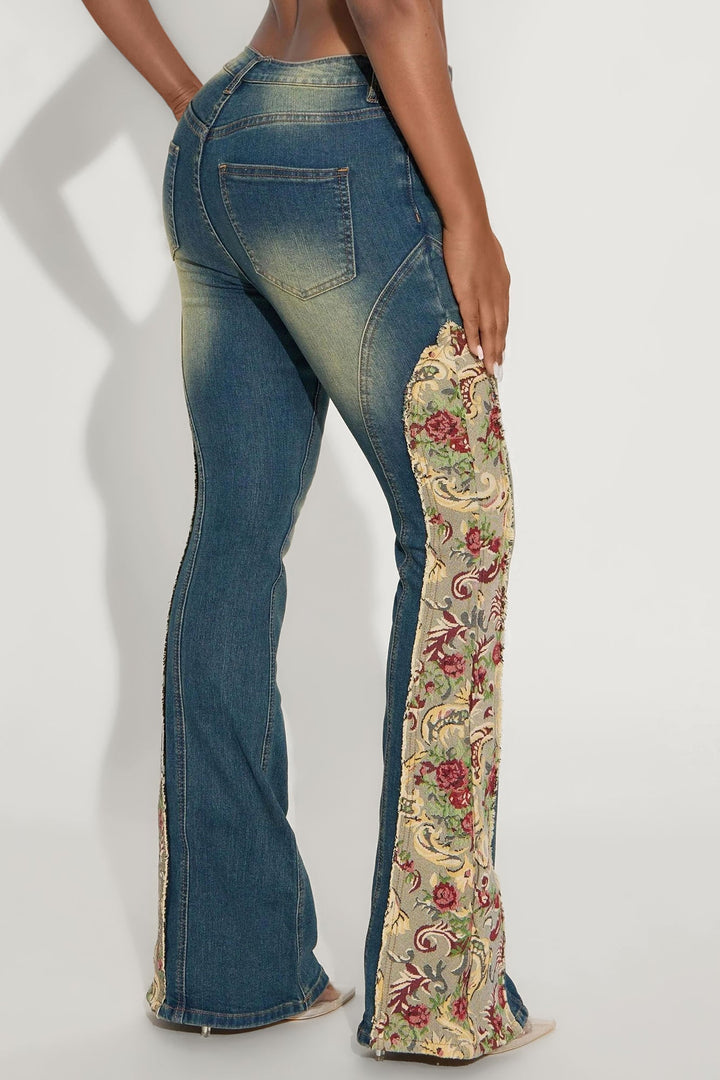 Available In Dark Wash. | Pair With Amari Floral Denim Corset Top | Extreme Flare Jean | 5 Pocket | Floral Paneling | Seaming | 11" High Rise | 34" Inseam | High Stretch | Disclaimer: Due To The Specialized Wash, Each Garment Is Unique. | Self: 68% Cotton 26% Polyester 4% Rayon 2% Spandex | Contrast: 70% Polyester 30% Cotton | Imported