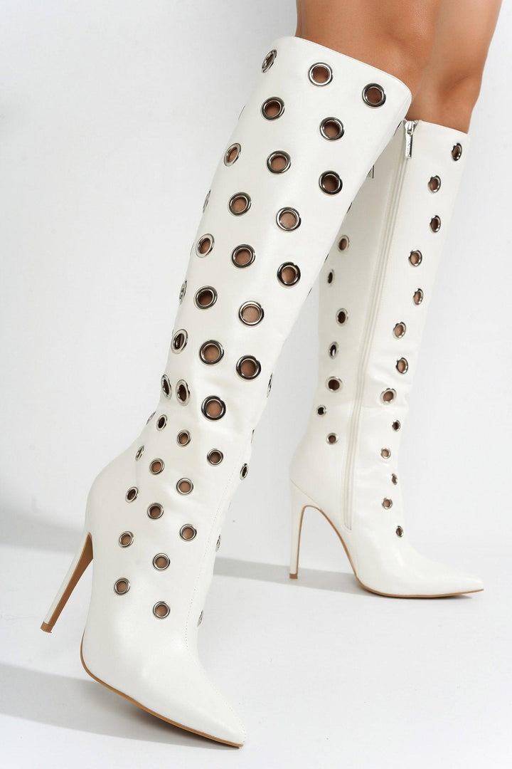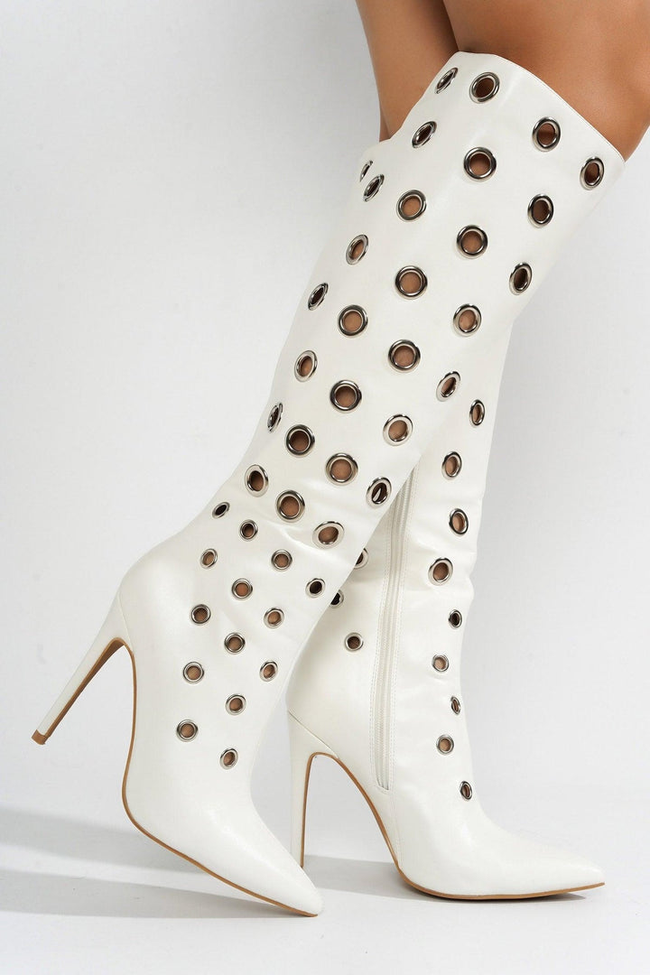 AMES - WHITE - BOOTS by CAPE ROBBIN closed pointy toe eyelet-embellished lightly cushioned footbed PU zipper closure rubber outsole Ames will make you look stunning on any given day. Features a knee-high silhouette trimmed with eyelets. These high-heeled boots are a fashion statement and a show-stopper.