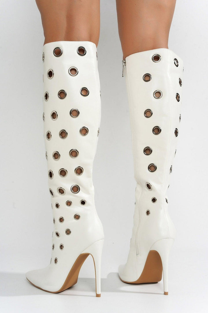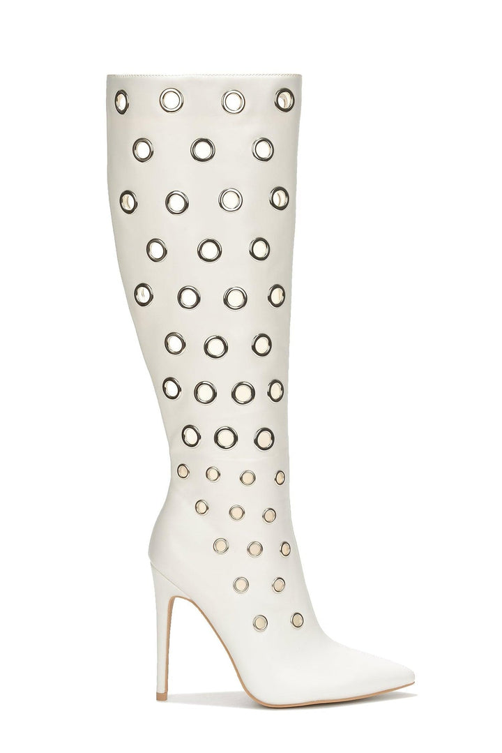 AMES - WHITE - BOOTS by CAPE ROBBIN closed pointy toe eyelet-embellished lightly cushioned footbed PU zipper closure rubber outsole Ames will make you look stunning on any given day. Features a knee-high silhouette trimmed with eyelets. These high-heeled boots are a fashion statement and a show-stopper.