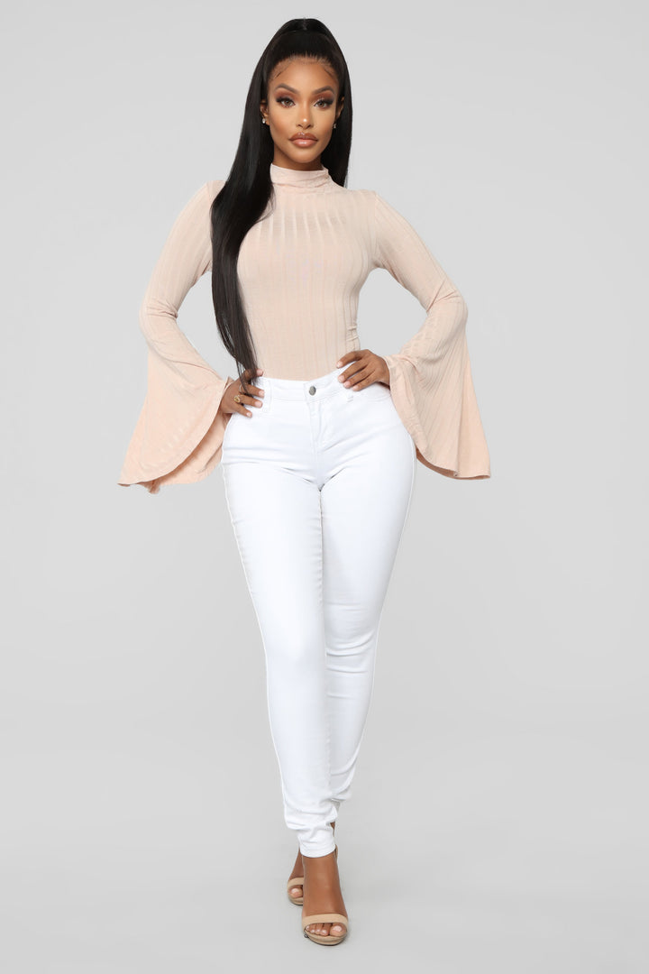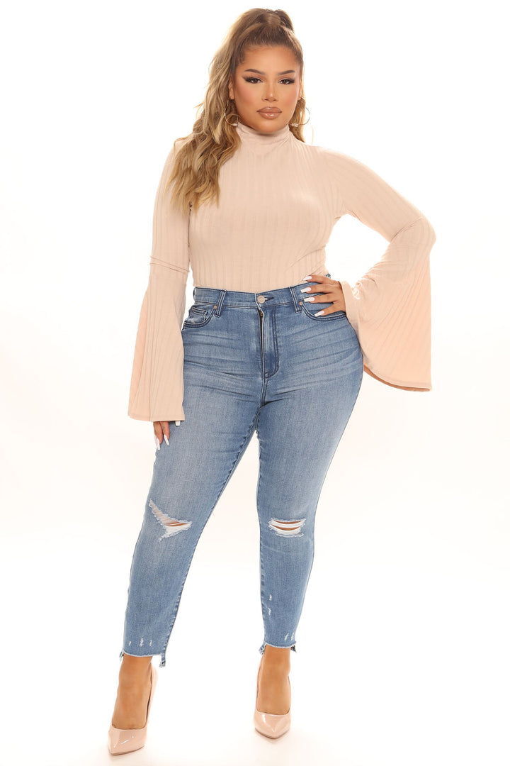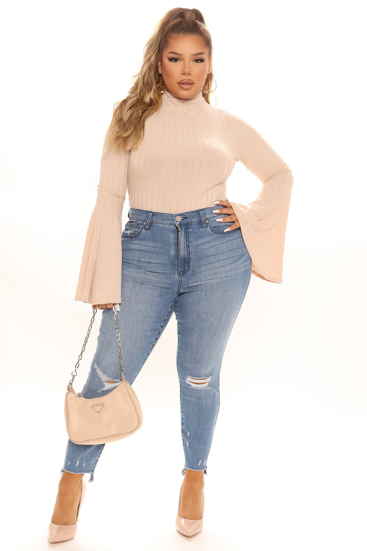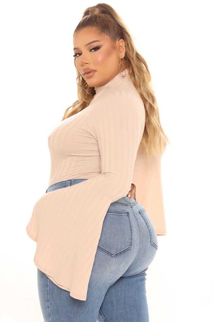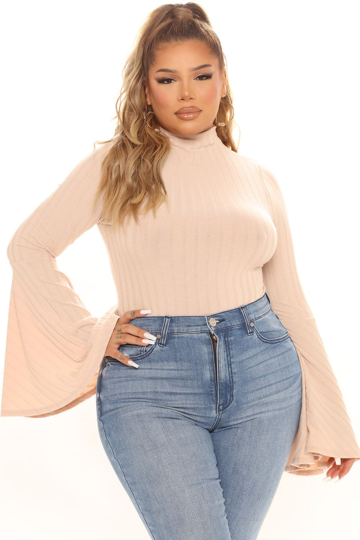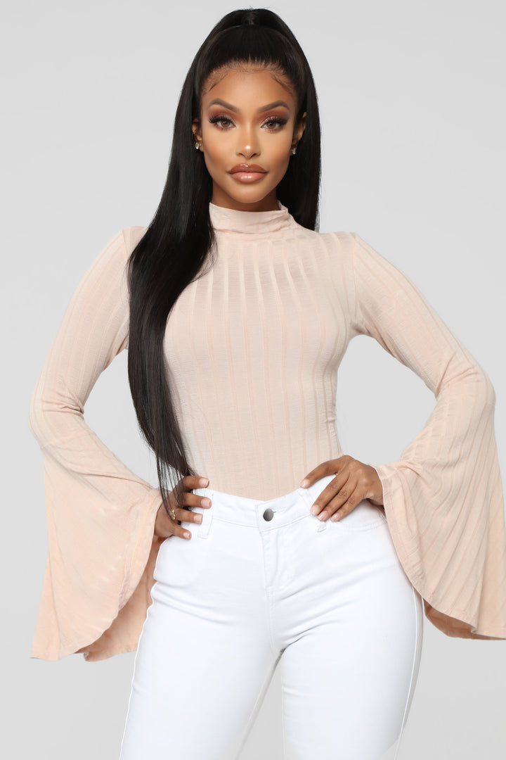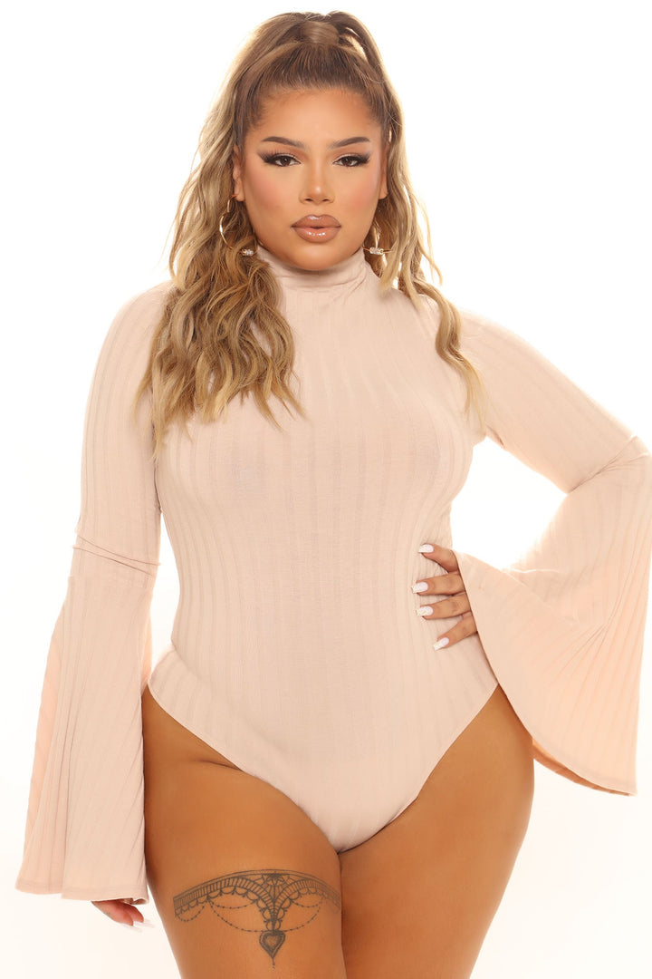 Available In Nude. | Mock Neck | Bell Sleeve | Cheeky Bottom | Snap Closure | 96% Rayon 4% Spandex | Imported | Final Sale