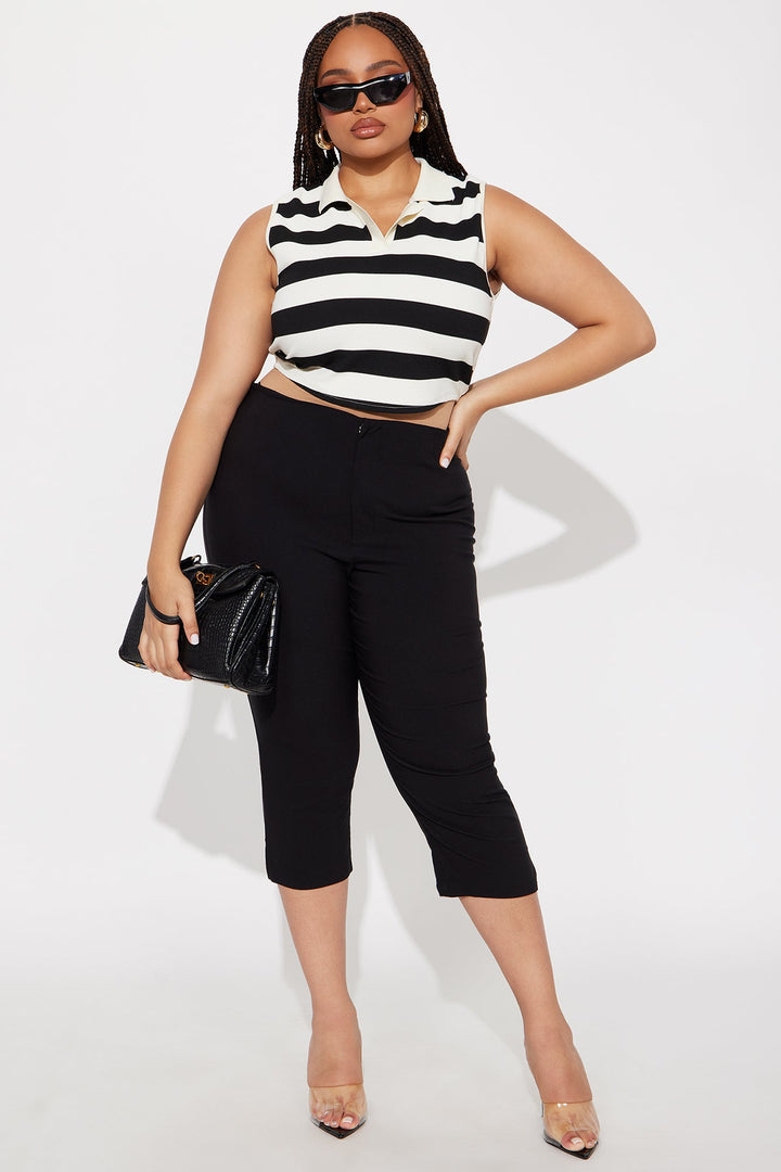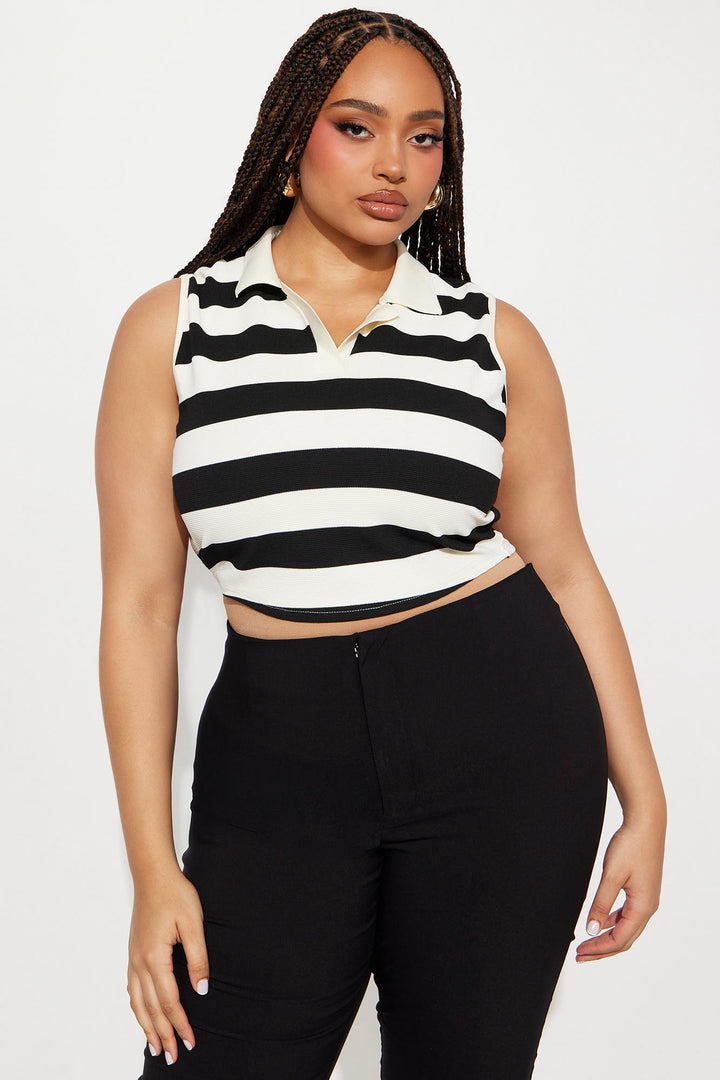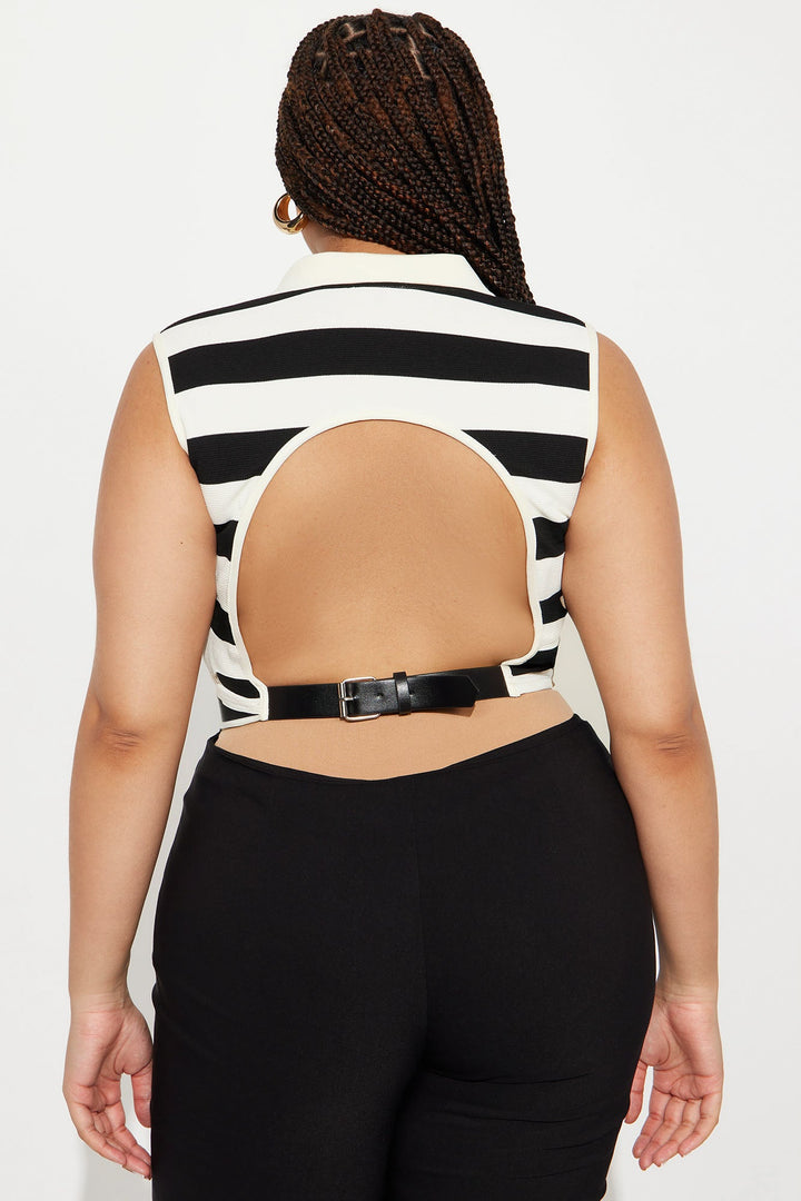 Available In Black/combo. | Top | Collar | Sleeveless | Backless | Buckle Back | Stretch | Self: 65% Polyester 32% Cotton 3% Spandex | Contrast: 95% Polyester 5% Spandex | Imported