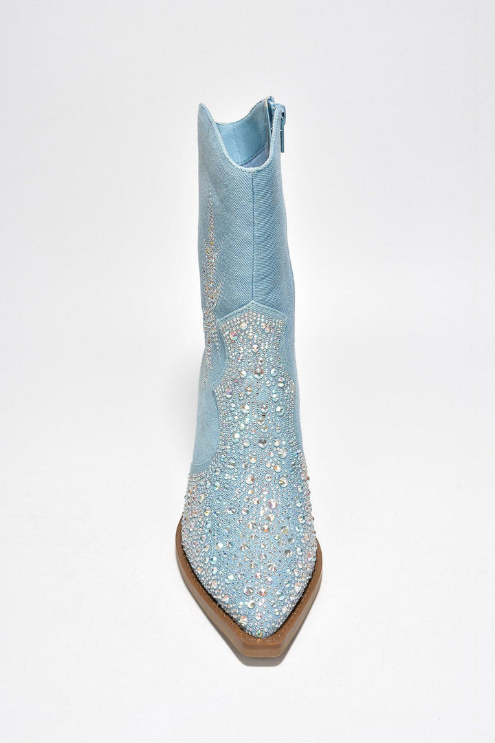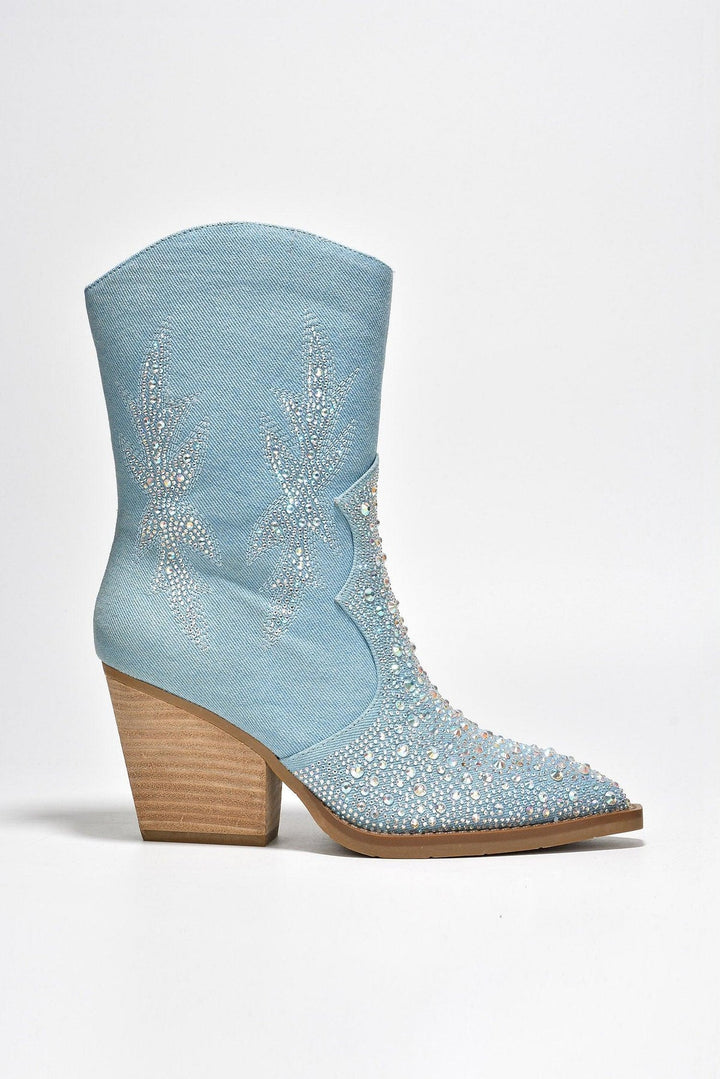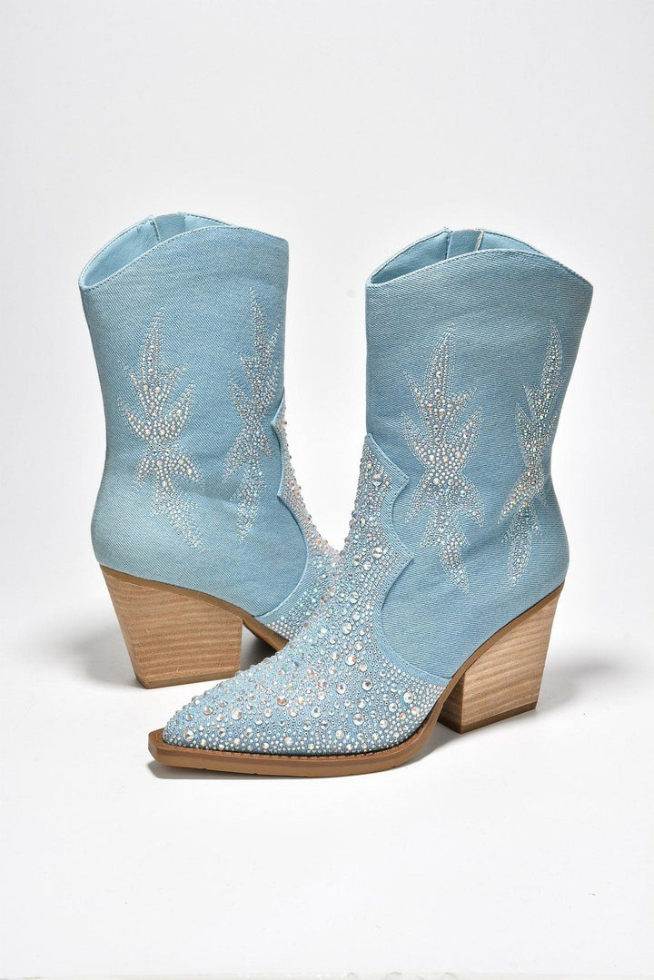 ANNETTA - DENIM - BOOTIES by CAPE ROBBIN closed pointy toe rhinestone trim zipper closure stacked block heel suede finish lightly cushioned footbed rubber outsole Rock out and party on! There's a new sheriff in town. Crafted from luxe materials,Cape Robbin's Annetta is a Western-influenced ankle bootie designed to turn casual outfits into a show-stopping ensemble. Perfect for your next music festival.