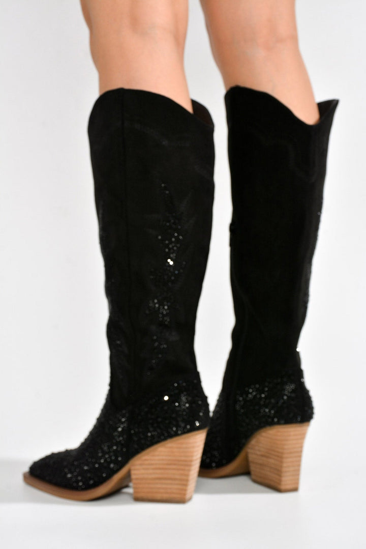 ANNISTON - BLACK - BOOTS by CAPE ROBBIN pointy toe cowboy boots Western-inspired rhinestone embellishment knee-high silhouette zipper closure block stacked heels suede finish Elevate your wardrobe when you add Anniston boots to your closet. Features a velvety suede finish,shiny rhinestone accents,and a knee-high silhouette. These Western-inspired boots know how to kickstart a fun night. Comes in silver,black,or ivory.