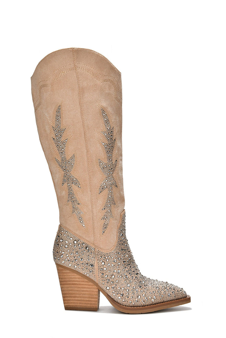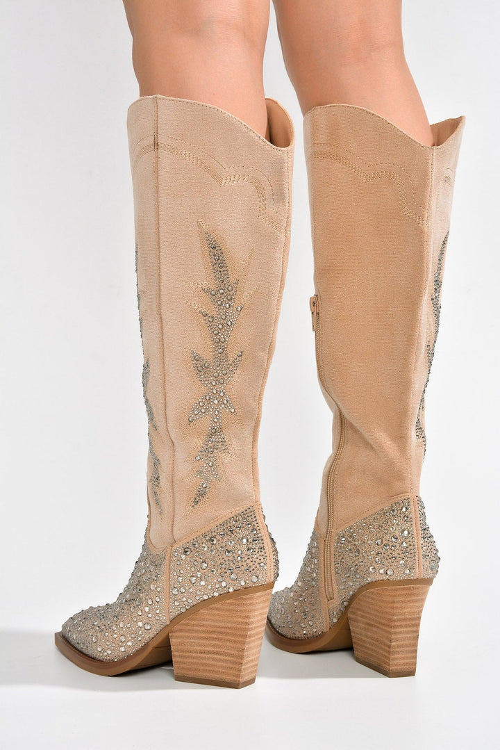 ANNISTON - IVORY - BOOTS by CAPE ROBBIN pointy toe cowboy boots Western-inspired rhinestone embellishment knee-high silhouette zipper closure block stacked heels suede finish Elevate your wardrobe when you add Anniston boots to your closet. Features a velvety suede finish,shiny rhinestone accents,and a knee-high silhouette. These Western-inspired boots know how to kickstart a fun night. Comes in silver,black,or ivory.