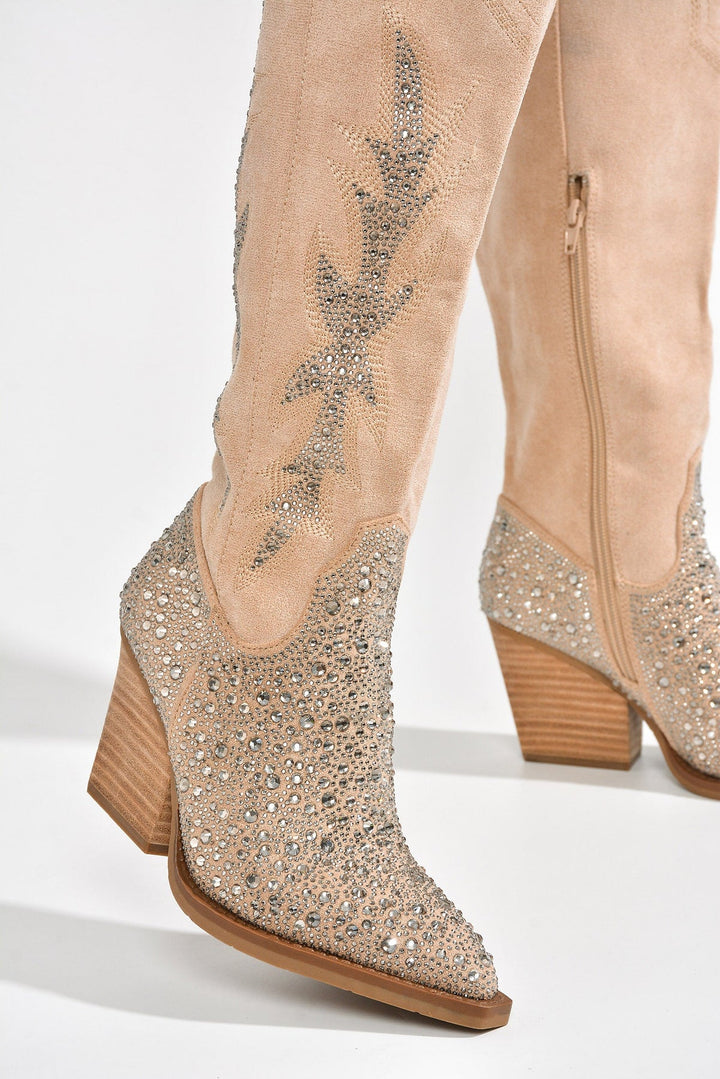 ANNISTON - IVORY - BOOTS by CAPE ROBBIN pointy toe cowboy boots Western-inspired rhinestone embellishment knee-high silhouette zipper closure block stacked heels suede finish Elevate your wardrobe when you add Anniston boots to your closet. Features a velvety suede finish,shiny rhinestone accents,and a knee-high silhouette. These Western-inspired boots know how to kickstart a fun night. Comes in silver,black,or ivory.