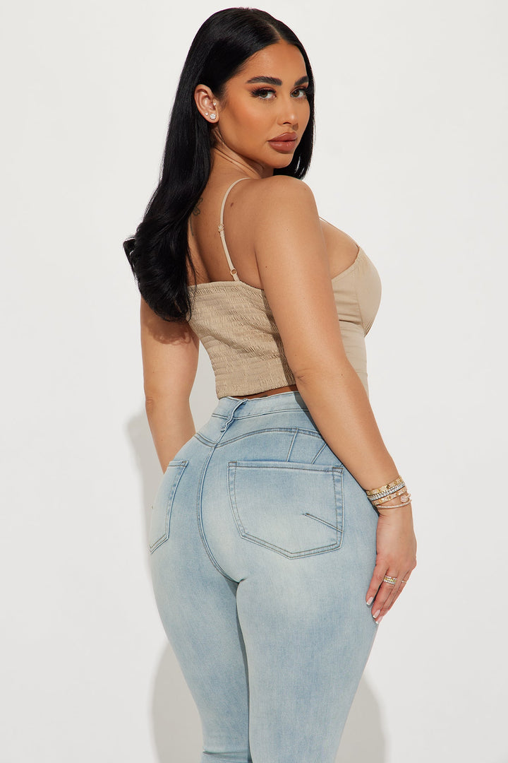 Available In Black, Pink, Sand And White. | Poplin Corset Top | Adjustable Spaghetti Straps | Sweetheart | Tie Front | Smocked Back | Cropped | Non Stretch | 63% Cotton 34% Polyester 3% Spandex | Imported