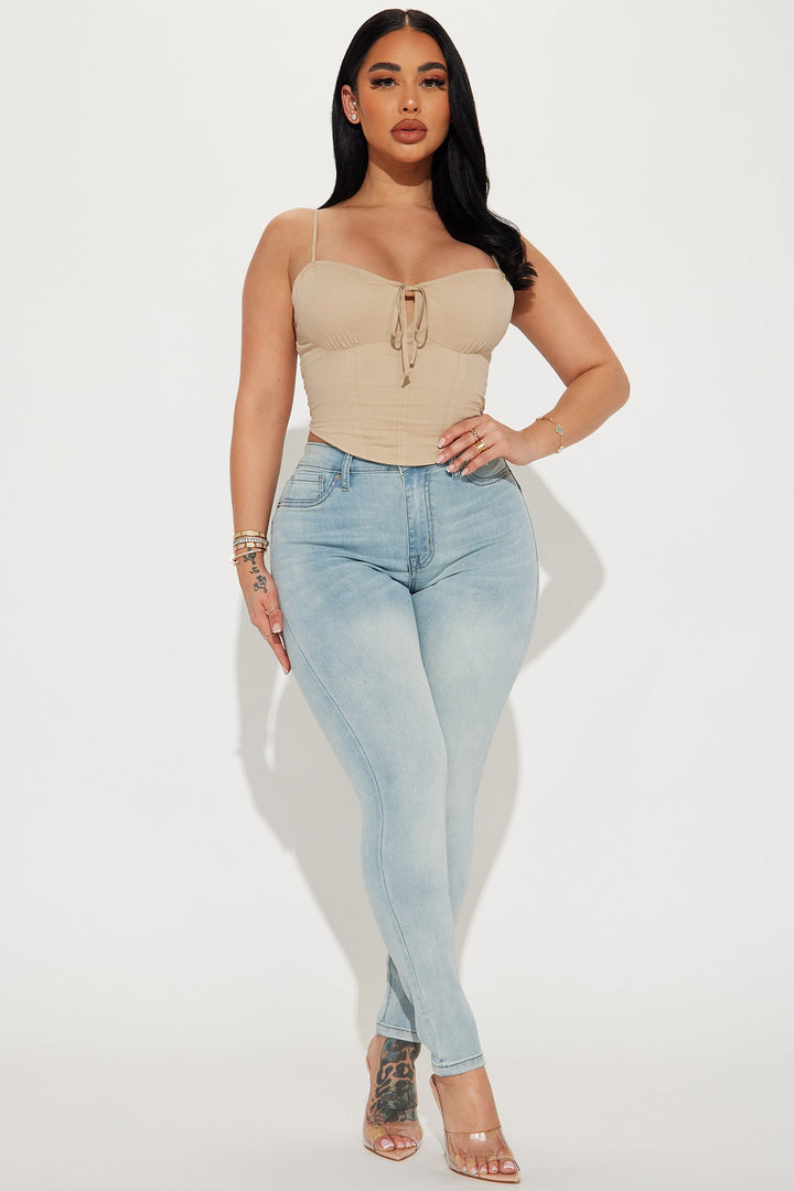 Available In Black, Pink, Sand And White. | Poplin Corset Top | Adjustable Spaghetti Straps | Sweetheart | Tie Front | Smocked Back | Cropped | Non Stretch | 63% Cotton 34% Polyester 3% Spandex | Imported