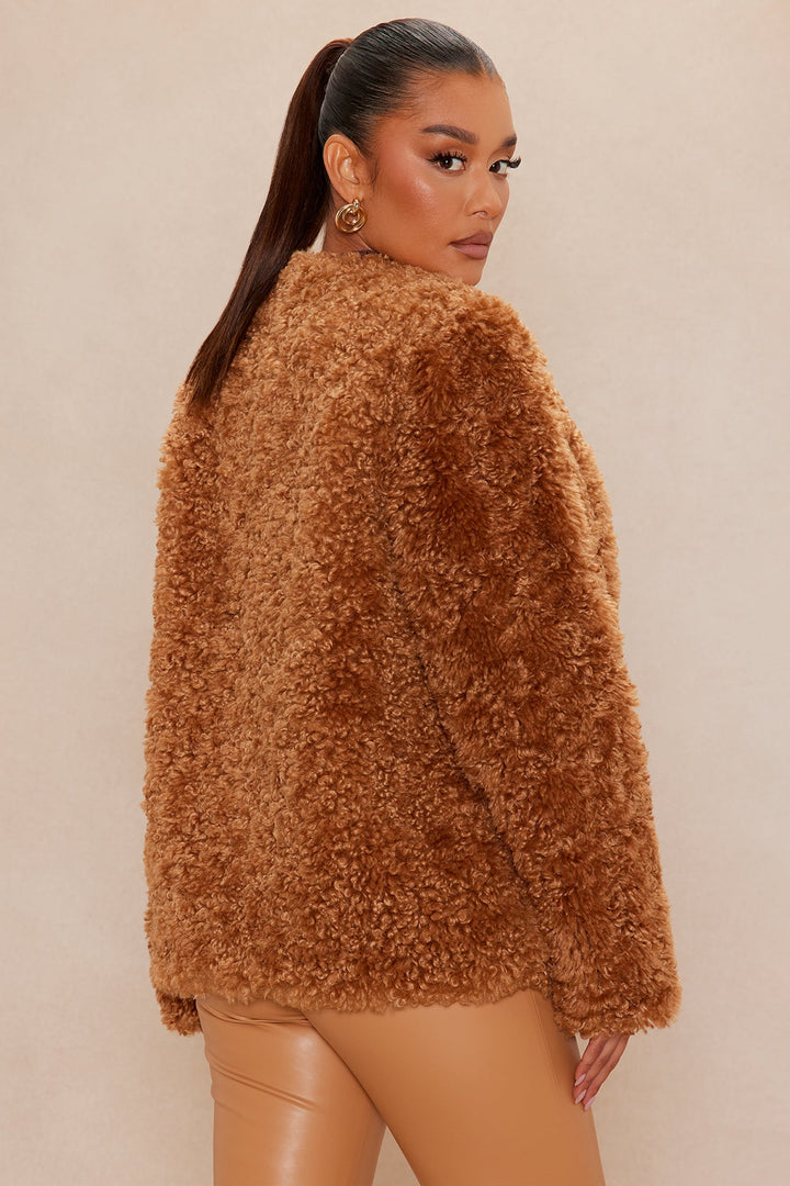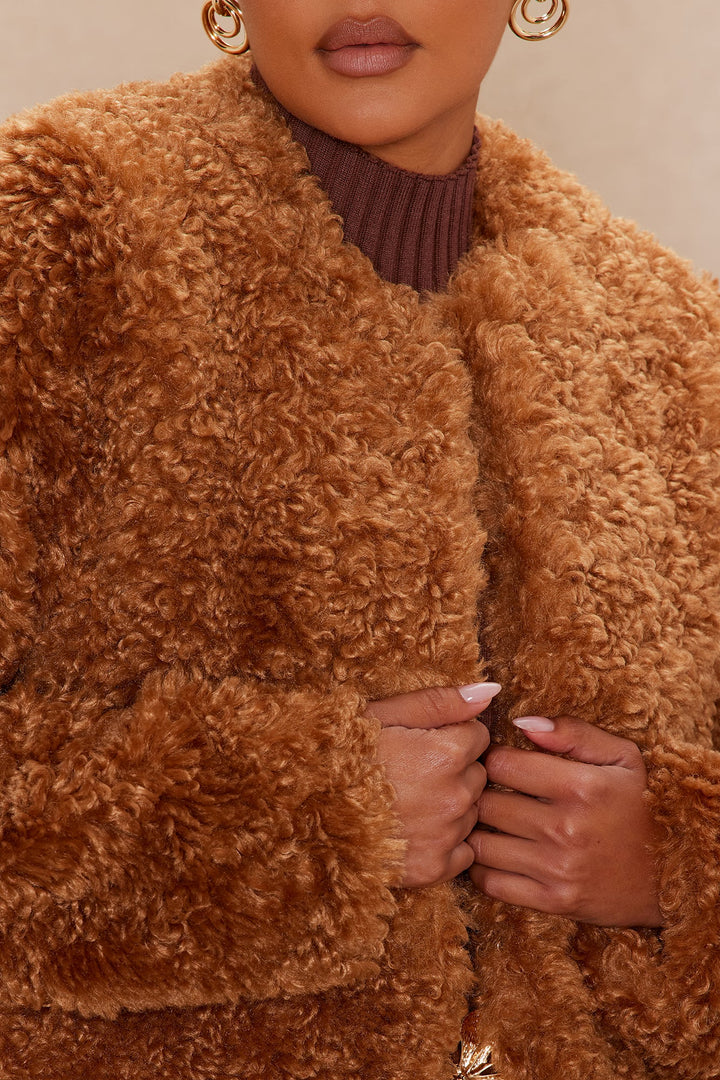 Available In Burgundy And Camel. | Sherpa Fur Jacket | Long Sleeve | Shoulder | Pads | Pockets | Front Hook And Eye Closures | Lined | Non Stretch | Shell: 100% Polyester | Lining: 95% Polyester 5% Spandex | Imported
