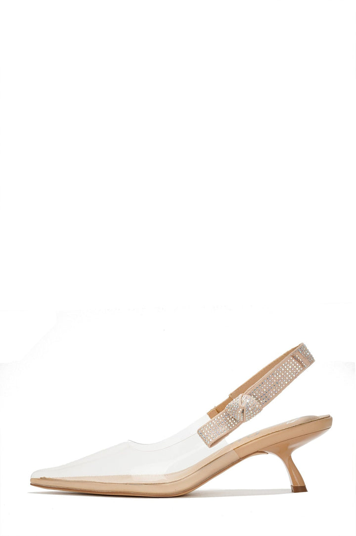 ARDYS - CLEAR - HEELS by CAPE ROBBIN Kitten heel: 1.5-inch Slingback PU leather insole for added comfort clear upper with rhinestone embellished Pointed toe Enhance your footwear collection with the Ardys Rhinestone Slingback Transparent Kitten Pump Heels. Design with clear finish and rhinestone detailing, pointed toe silhouette and ktten heel for a refined look, these pumps will ensure you look sophisticated and stylish with every step.