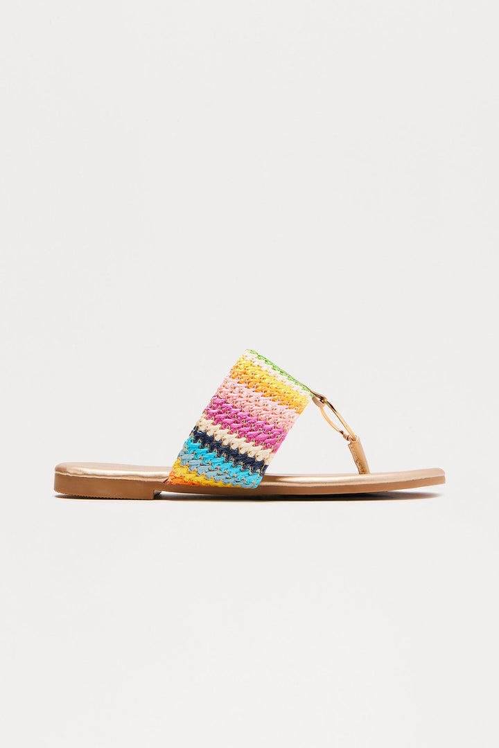 Available In Black, Ivory And Multi Color. | Flat Sandals | Raffia Strap | Hardware Detail | Round Toe | Flat Heel | Imported