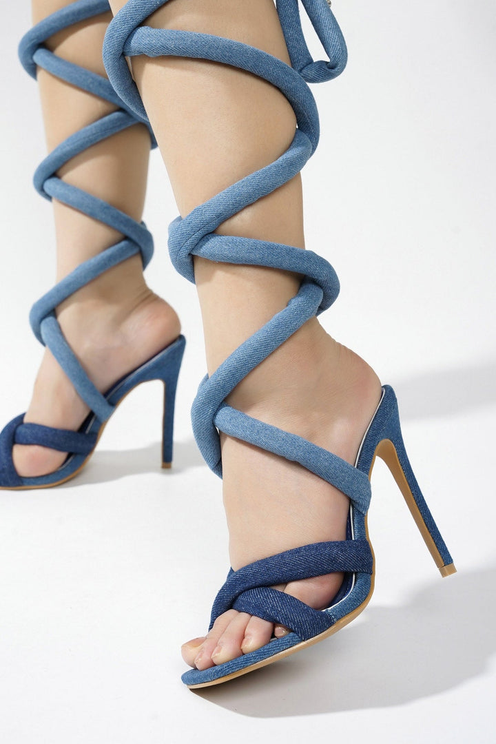 ASTRID - DENIM - HEELS by CAPE ROBBIN Stiletto heel: 4 inch Spiral Thick Lace-up strappy closure PU leather insole with memory foam cushioning for added comfort Available in pink PU leather zebra print or denim thick lace Square toe Make a bold statement with Astrid fashion-forward thick lace-up high heels. Featuring a thick lace strappy design that spirals up the leg,these high heels blend colorful and playful elements,making them perfect for both chic daytime outings and glamorous evening events. Pair them with your favorite dresses or skirts.