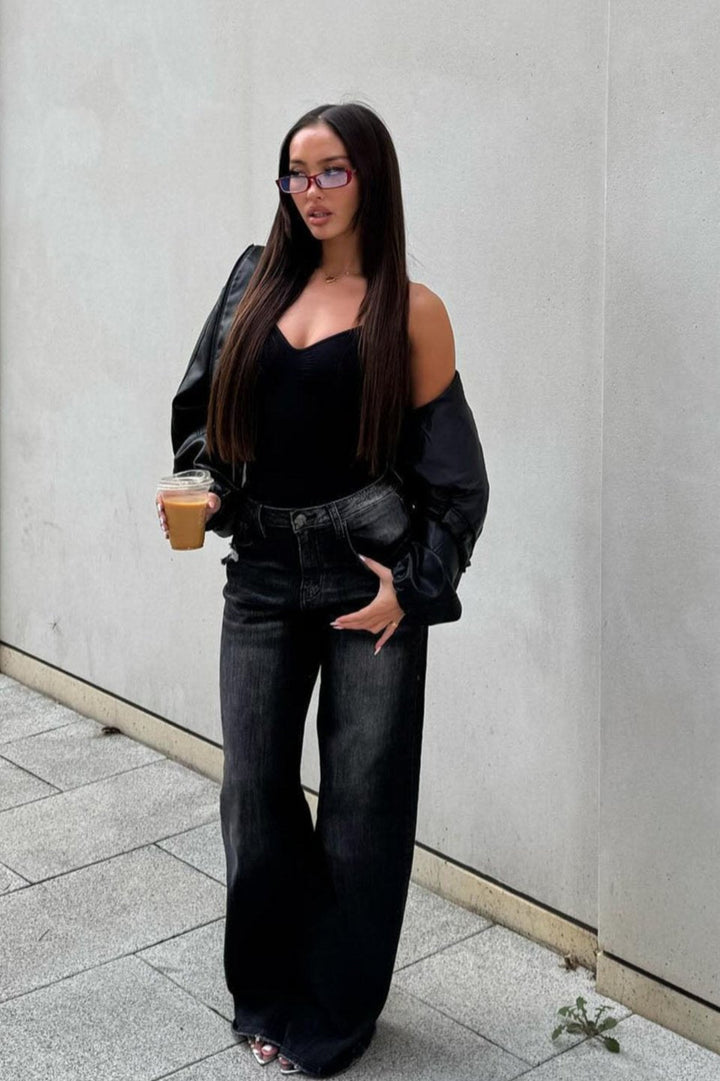 Available In Black Wash. | Wide Leg Jean | 5 Pocket | Ripped | 11.25" High Rise | 33" Inseam | Disclaimer: Due To The Specialized Wash & Distressing Process, Each Garment Is Unique | 98% Cotton 2% Spandex | Medium Stretch | Pair With Astrid Stretch Denim Jacket | Imported