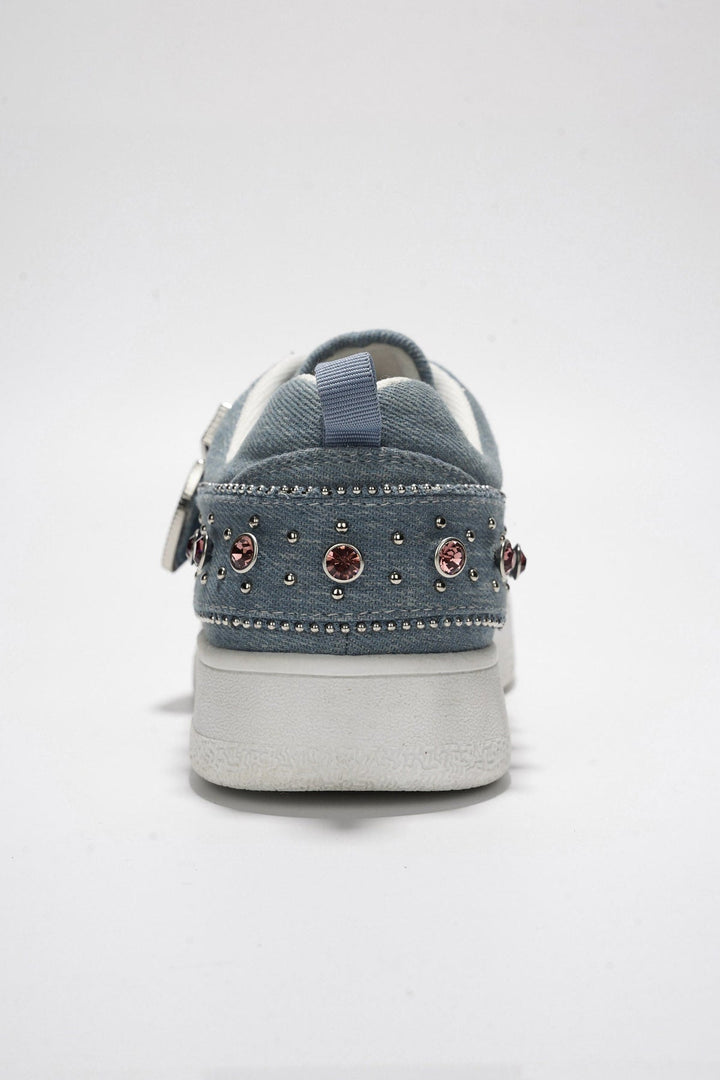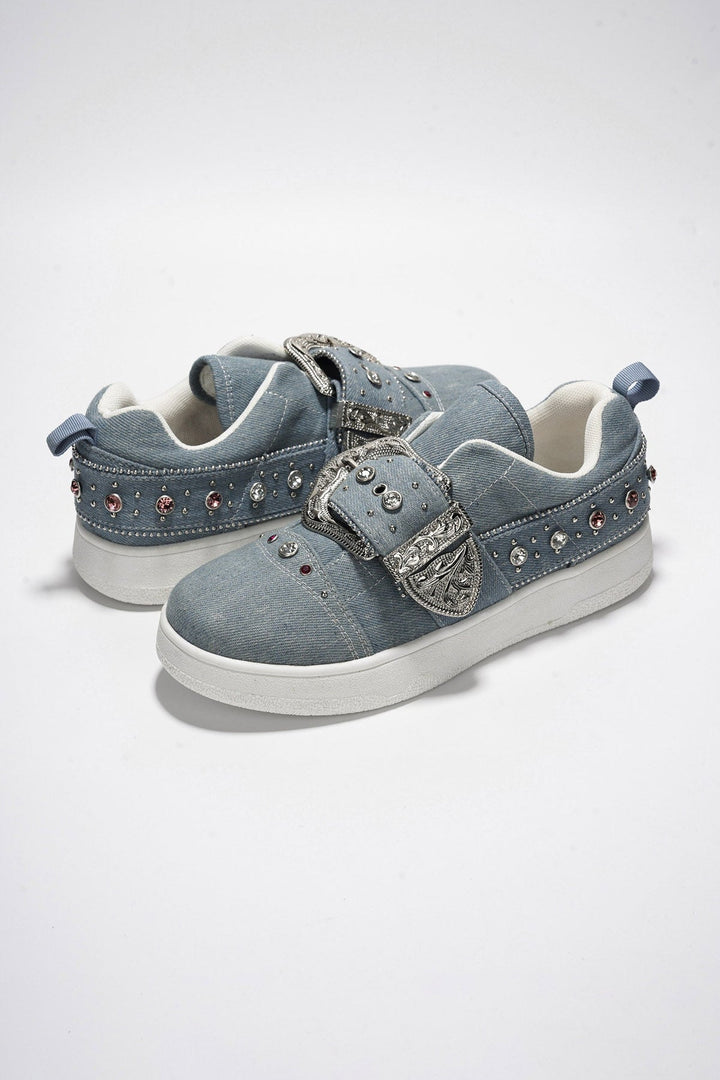 AUDRA - DENIM - SNEAKERS by CAPE ROBBIN Heel Height: 1-inch Slip on with adjustable buckle on vamp Memory foam insole for added comfort Gemstone embellished Round toe Step up your style game with the Audra Denim Sneakers, where comfort meets chic design. These standout sneakers feature a unique denim upper adorned with an eye-catching decorative buckle, blending casual ease with a touch of elegance. \
