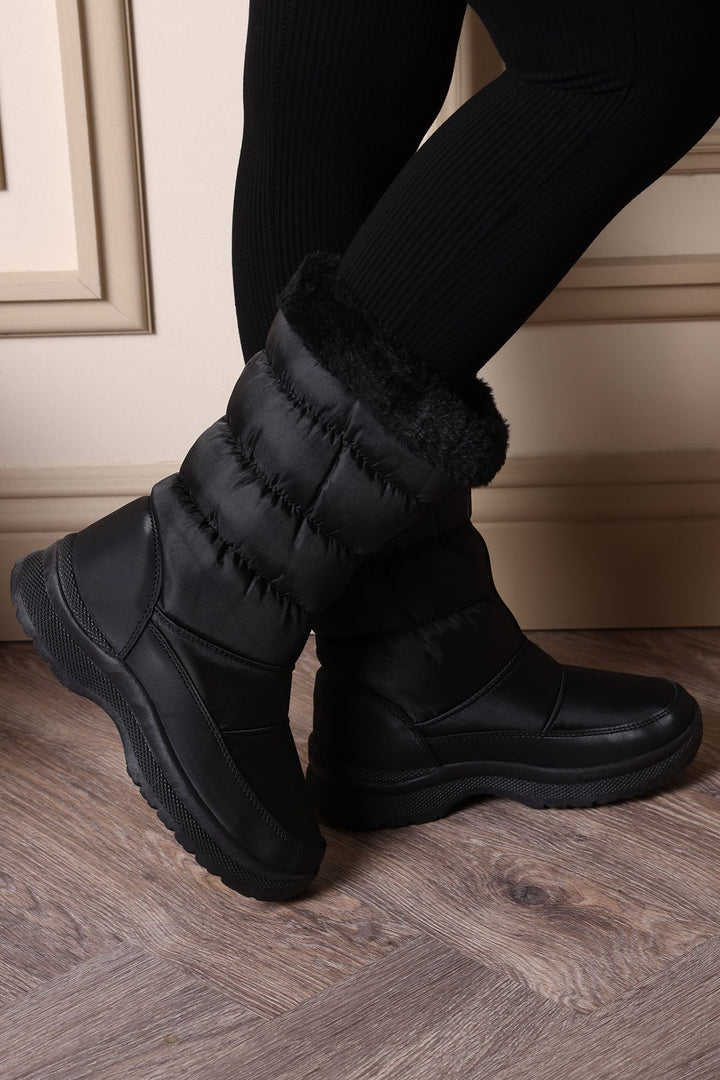 Available In Black. | Round Toe | Puffy Nylon Boot | Faux Fur Detail | Imported
