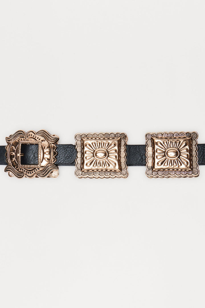 Available In Black/Gold And Cognac. | Faux Leather Material | Hardware Detail | Intricate Buckle Design | Length: 41" | 100% Polyurethane | Imported