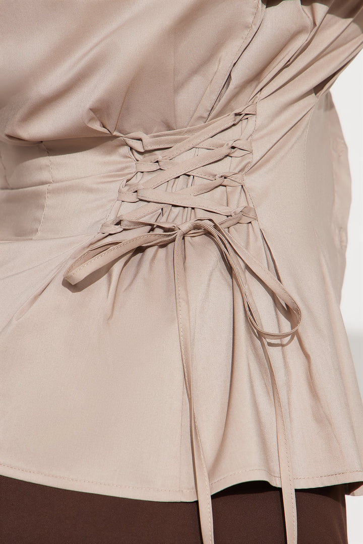 Available In Taupe And White. | Poplin Shirt | Lace Up Detail | Button Up | Non Stretch | 95% Polyester 5% Spandex | Imported