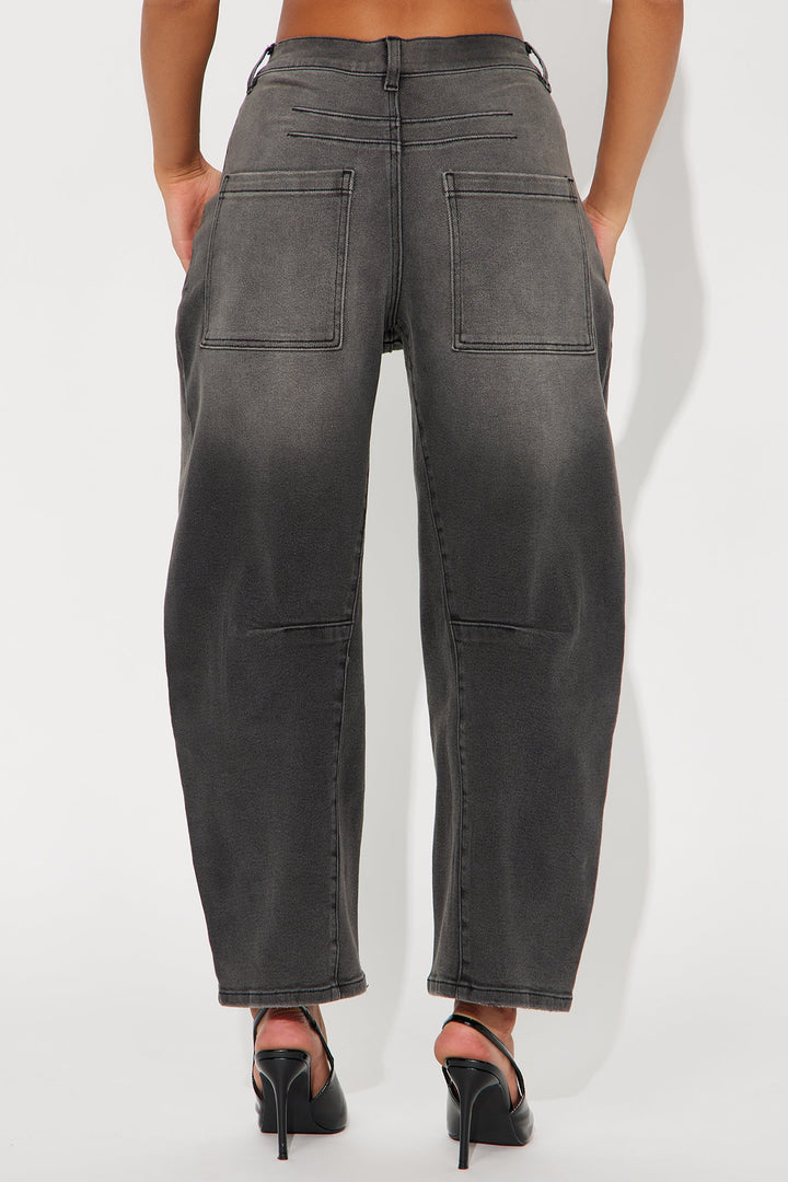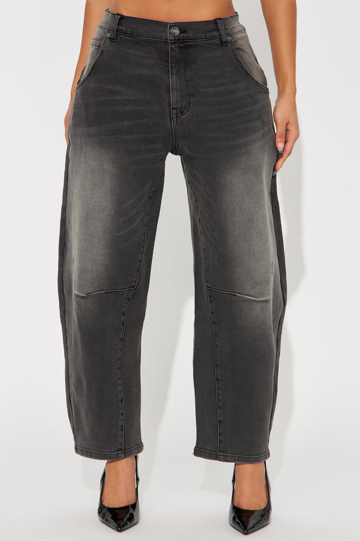 Available In Black Wash And Vintage Wash. | Barrel Leg Jean | 5 Pocket | Oversized Pockets | Knee Darts | 11.5" Rise | 26" Inseam | Medium Stretch | Disclaimer: Due To The Specialized Wash, Each Garment Is Unique. | 65% Cotton 30% Polyester 4% Other Fiber 1% Spandex | Imported