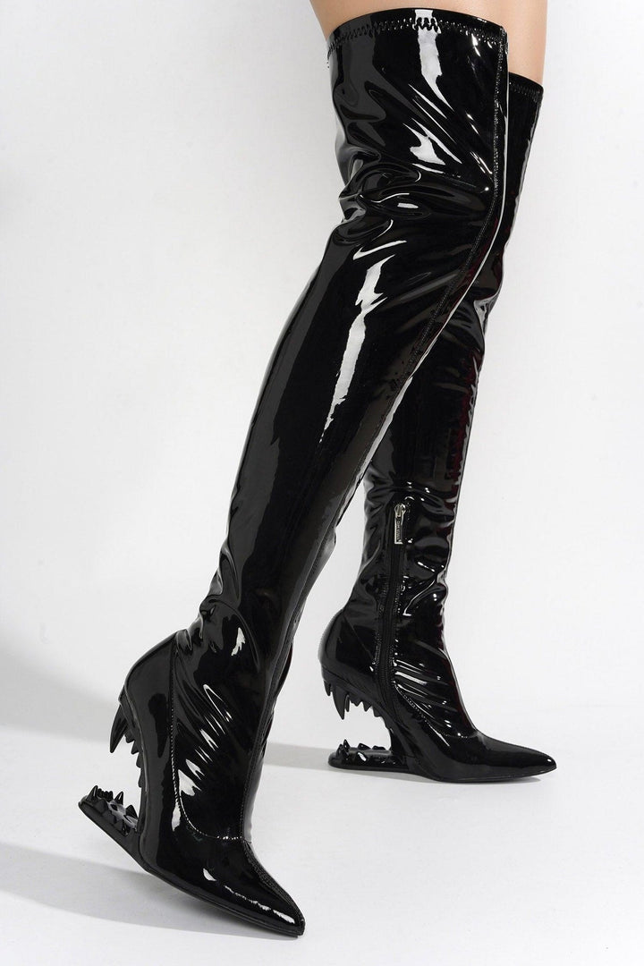 BAKU - BLACK - BOOTS by CAPE ROBBIN pointy toe cheetah teeth-inspired odd shaped heel patent elastic band thigh-high boots These odd-shaped heel boots don't bite,but they are a fetch! They're fierce and will definitely catch a lot of looks.
