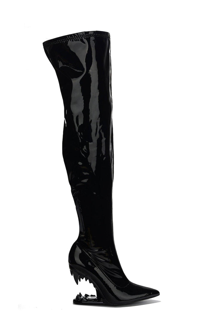 BAKU - BLACK - BOOTS by CAPE ROBBIN pointy toe cheetah teeth-inspired odd shaped heel patent elastic band thigh-high boots These odd-shaped heel boots don't bite,but they are a fetch! They're fierce and will definitely catch a lot of looks.