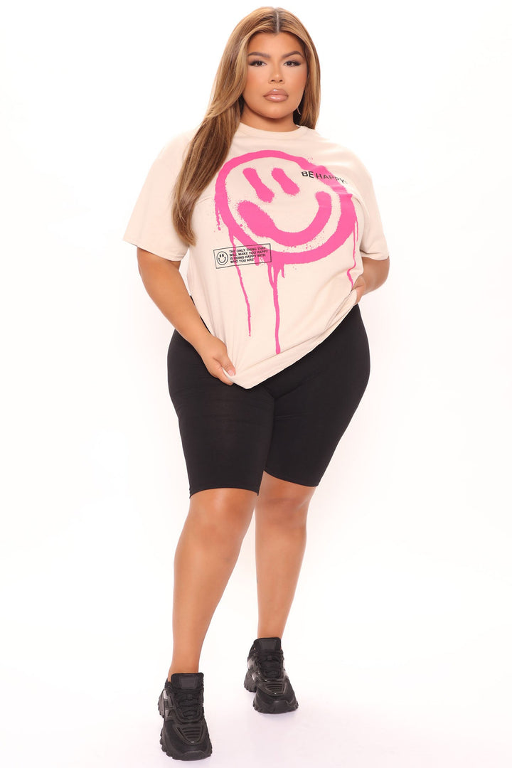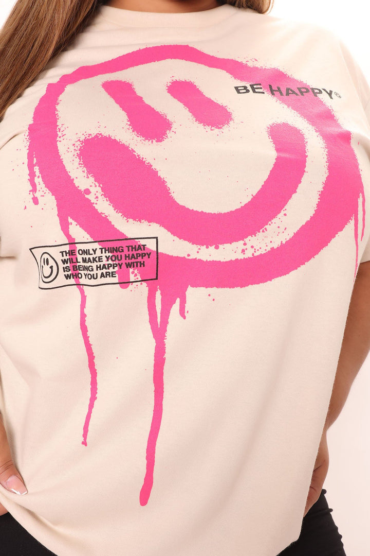 Available In Nude. | "Be Happy" Verbiage | Crew Neck | Short Sleeve | Smiley Face Graphic | Disclaimer: Due To The Printing Process A Difference In Saturation May Occur. Each Garment Is Unique | 100% Cotton | Imported
