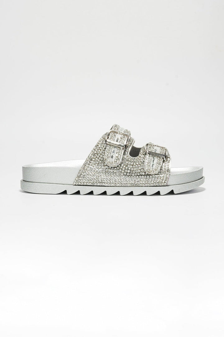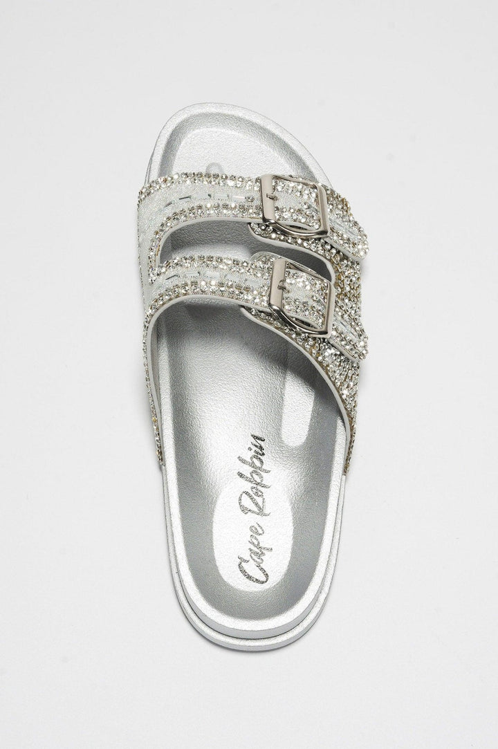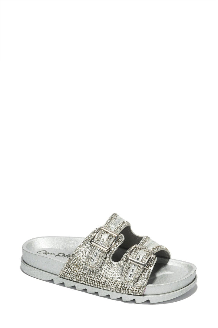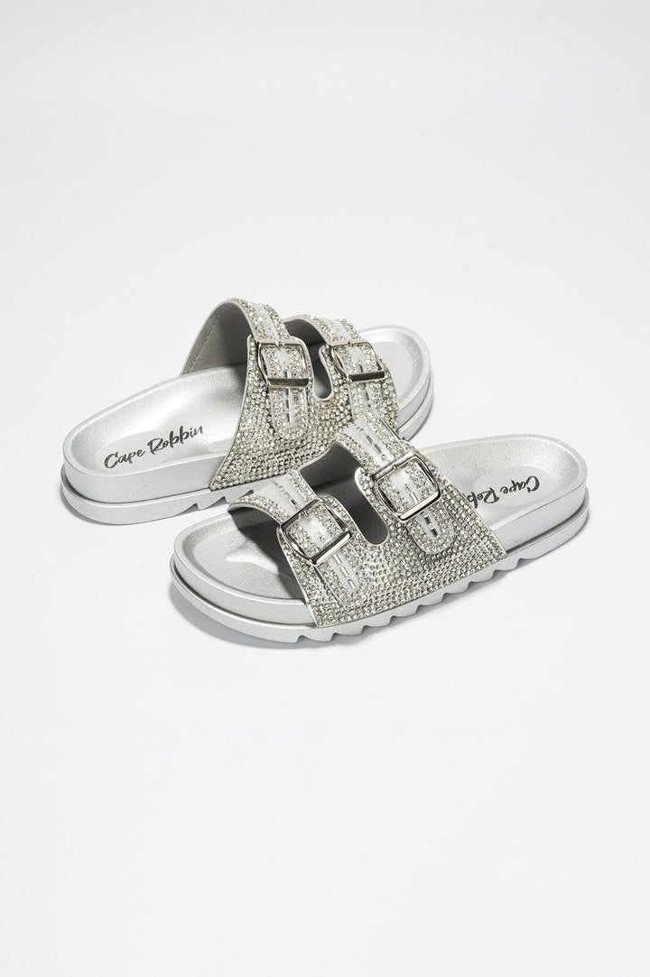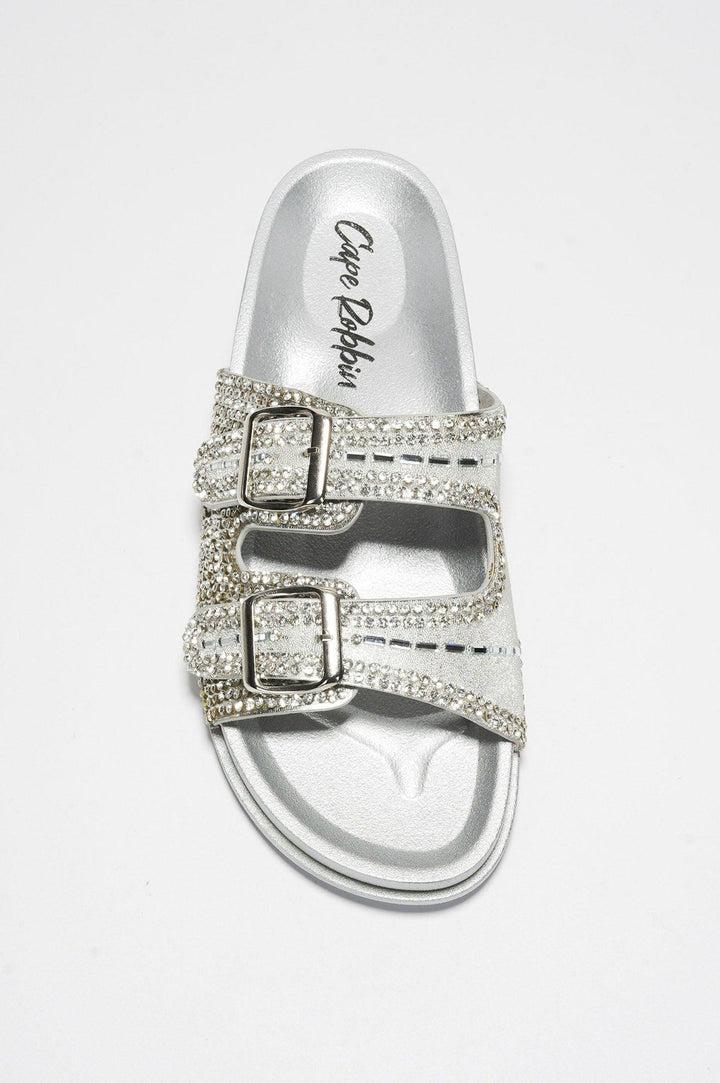 BECKY - SILVER - SANDALS by CAPE ROBBIN Heel: 0.5 inch Slip-on Contoured footbed Buckle strap Open toe The Becky Sandals are indeed a dazzling blend of style and comfort,perfect for any occasion. Pairing them with your favorite jeans and a t-shirt will create a casual yet stylish look,while dressing them up with a flowy dress will elevate your ensemble to a more elegant level. The rhinestone-embellished buckle strap adds a touch of glamour,making these sandals a versatile and fashionable choice for a variety of outfits and events.