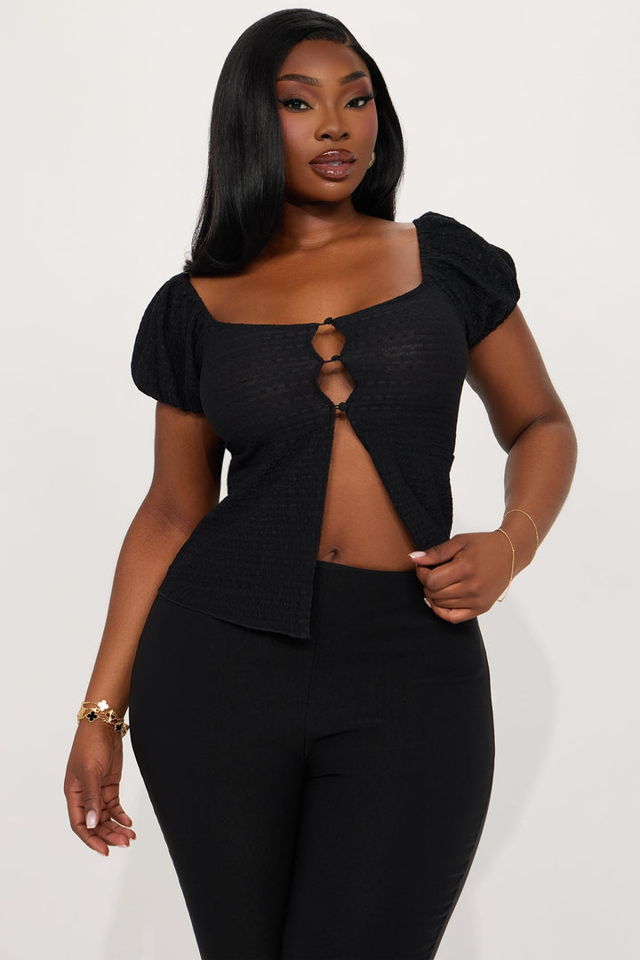 Available In Black, Chartreuse, Marsala And White. | Flyaway Top | Button Detail | Puff Sleeve | Open Front | Stretch | Self 95% Polyester 5% Spandex | Imported