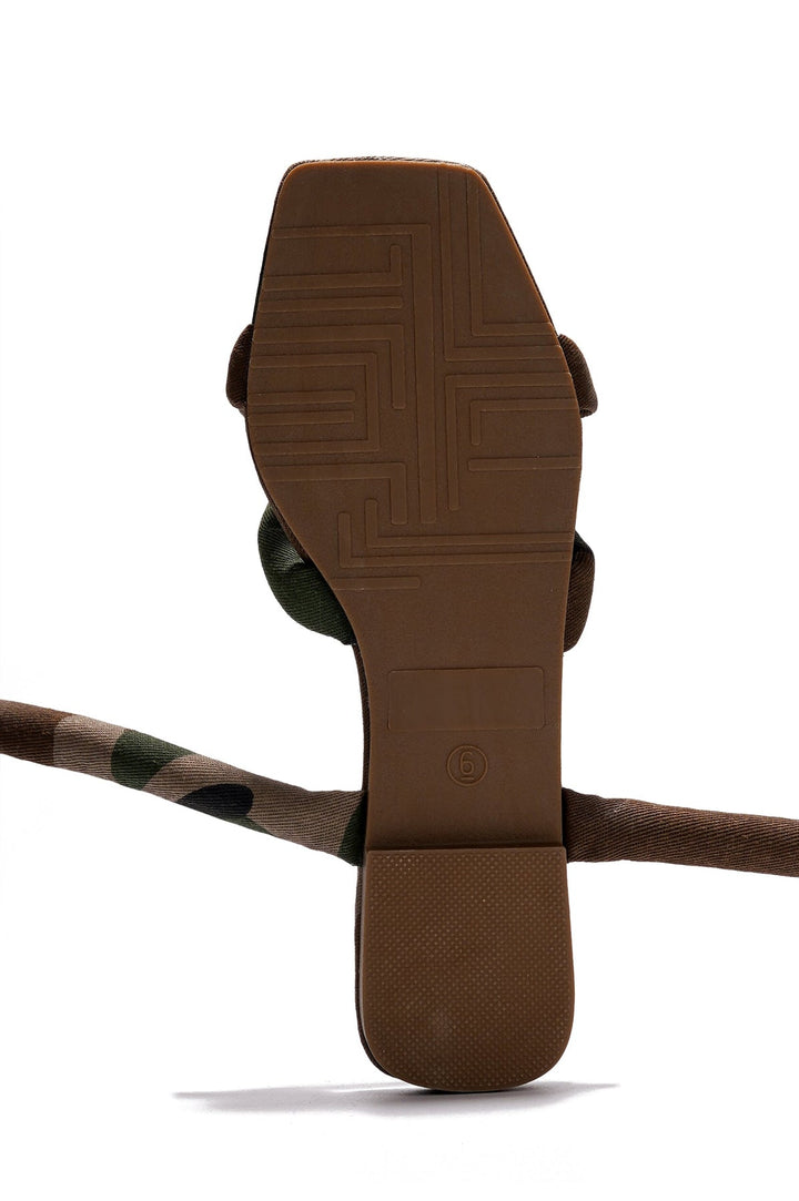 BERNETTE - CAMOUFLAGE - SANDALS by CAPE ROBBIN Heel height: flat Strappy thick lace PU leather insole with memory foam cushioning for added comfort Square toe Step into unique style with the Bernette Thick Lace Strappy Sandals. These eye-catching sandals feature soft, wrap-around straps that provide a touch of casual elegance and a comfortable fit. Perfect for casual occasions, they pair effortlessly with dresses, skirts, or shorts. The Bernette Sandals are a chic and versatile addition to your wardrobe, ideal for fashion-forward individuals.