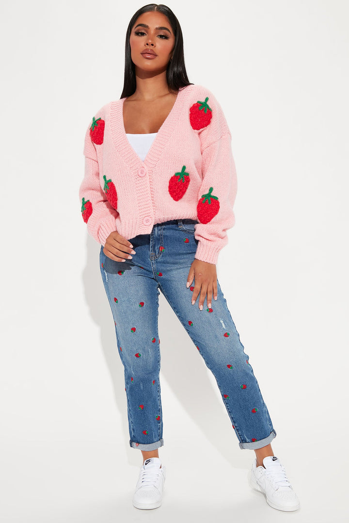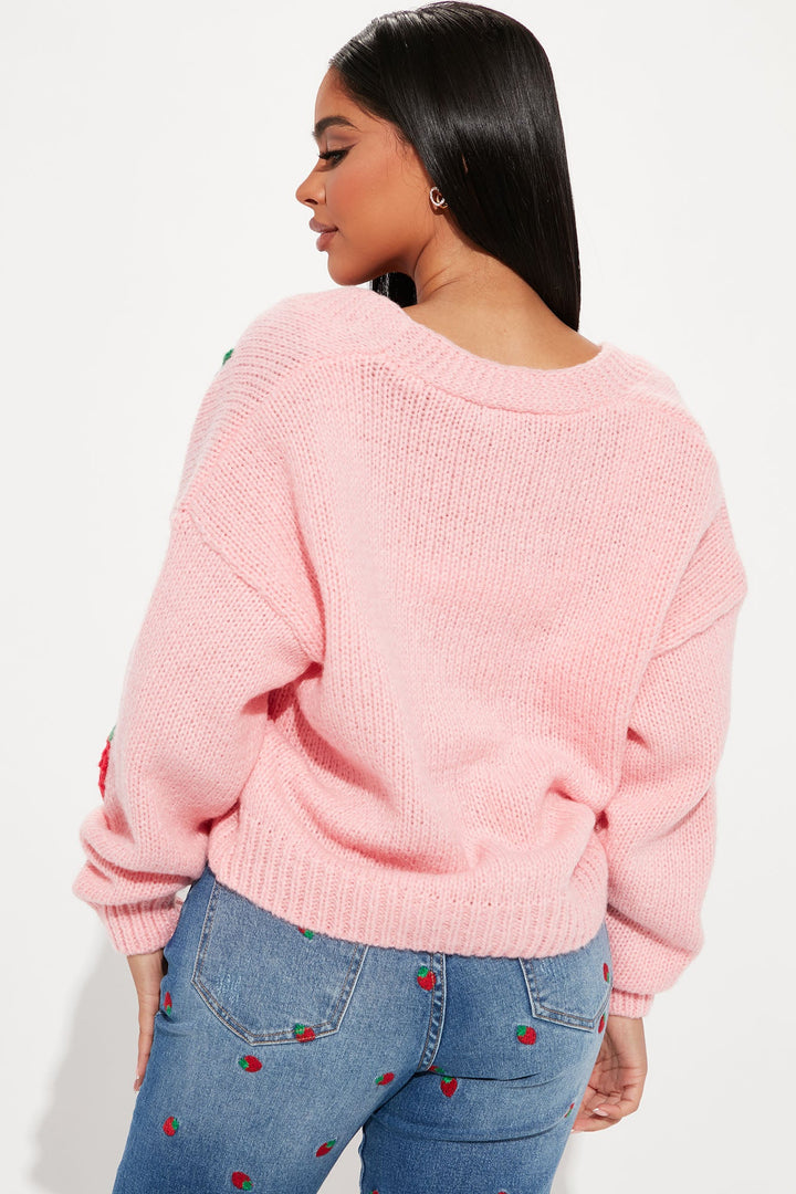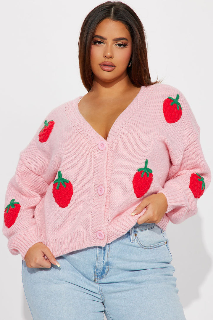 Available In Pink. | Cardigan Sweater | Chunky Knit | Strawberries | V Neck | Button Front | Long Sleeve | Disclaimer: Pattern Placement Will Vary | 100% Polyester | Imported