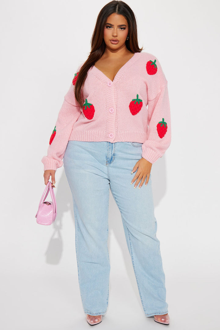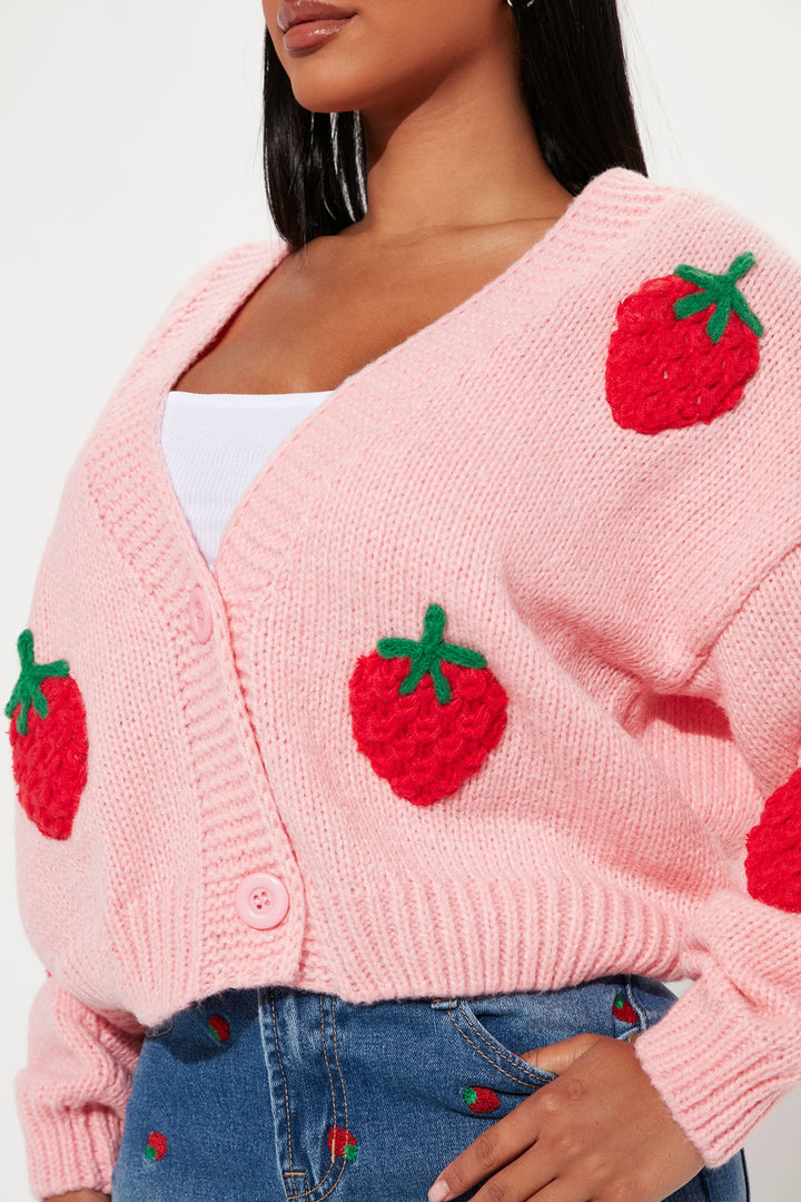 Available In Pink. | Cardigan Sweater | Chunky Knit | Strawberries | V Neck | Button Front | Long Sleeve | Disclaimer: Pattern Placement Will Vary | 100% Polyester | Imported
