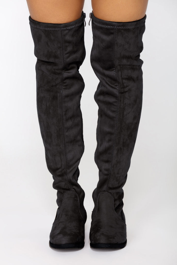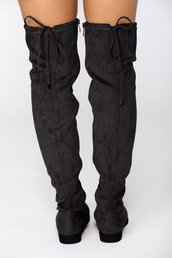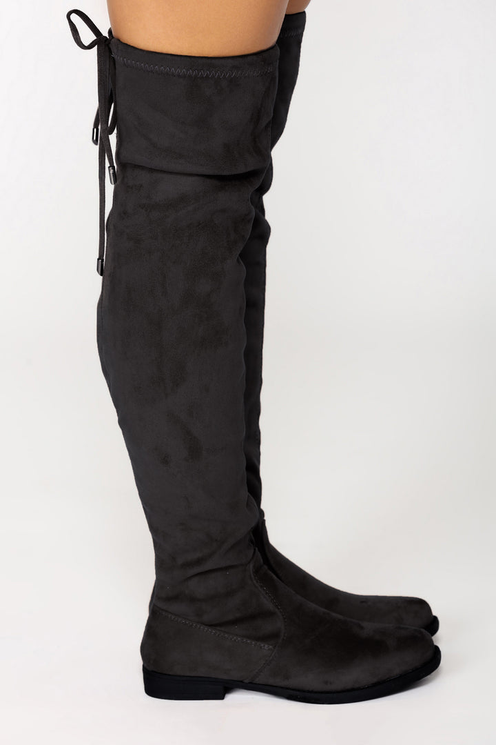 Available In Black And Taupe. | Over The Knee | Faux Suede | Back Tie | Inside Zipper | Imported
