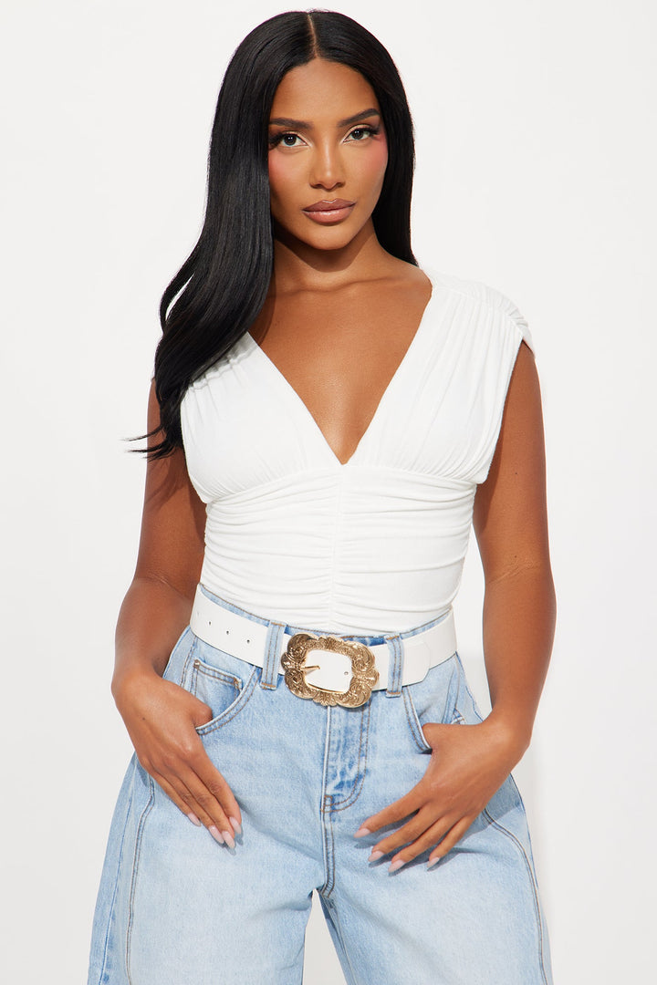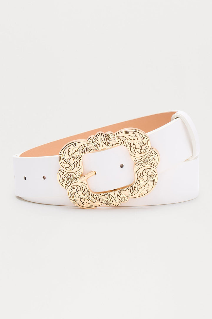 Available In White. | Faux Leather Belt | Intricate Buckle Detail | Length: 43" | 100% Polyurethane | Imported