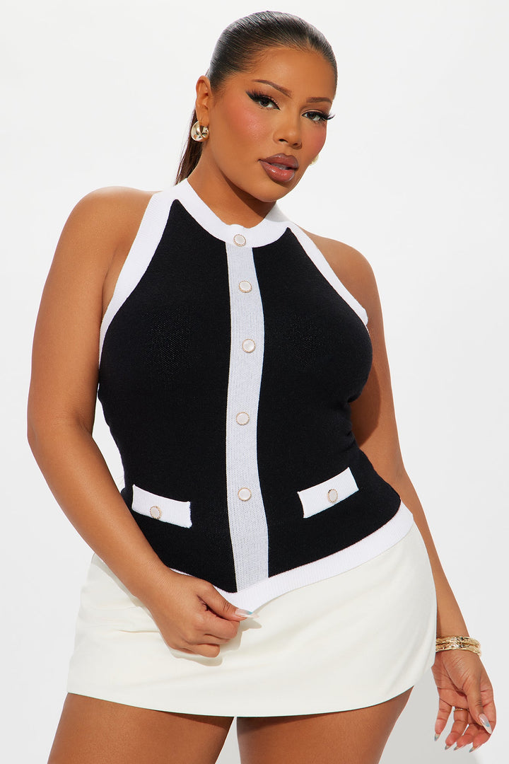 Available In Black/White And Yellow/combo. | Halter Top | Faux Buttons | Contrast Trim | Self: 50% Viscose 28% Nylon 22% Polyester | Imported