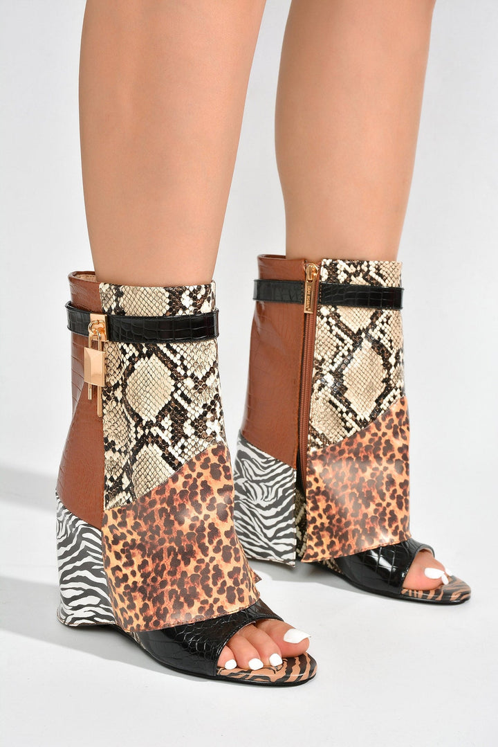 BETTERBABE - MULTI - BOOTS by CAPE ROBBIN round toe fold-over boots high heel wedge peep toe crocodile skin animal prints snakeskin Stay locked in and fashionable! Walk in these Betterbabe fold-over boots and be the evening's eye candy. The bold texture and combination will turn you into a trend-setting fashionista. Comes in denim,multi,or camo.