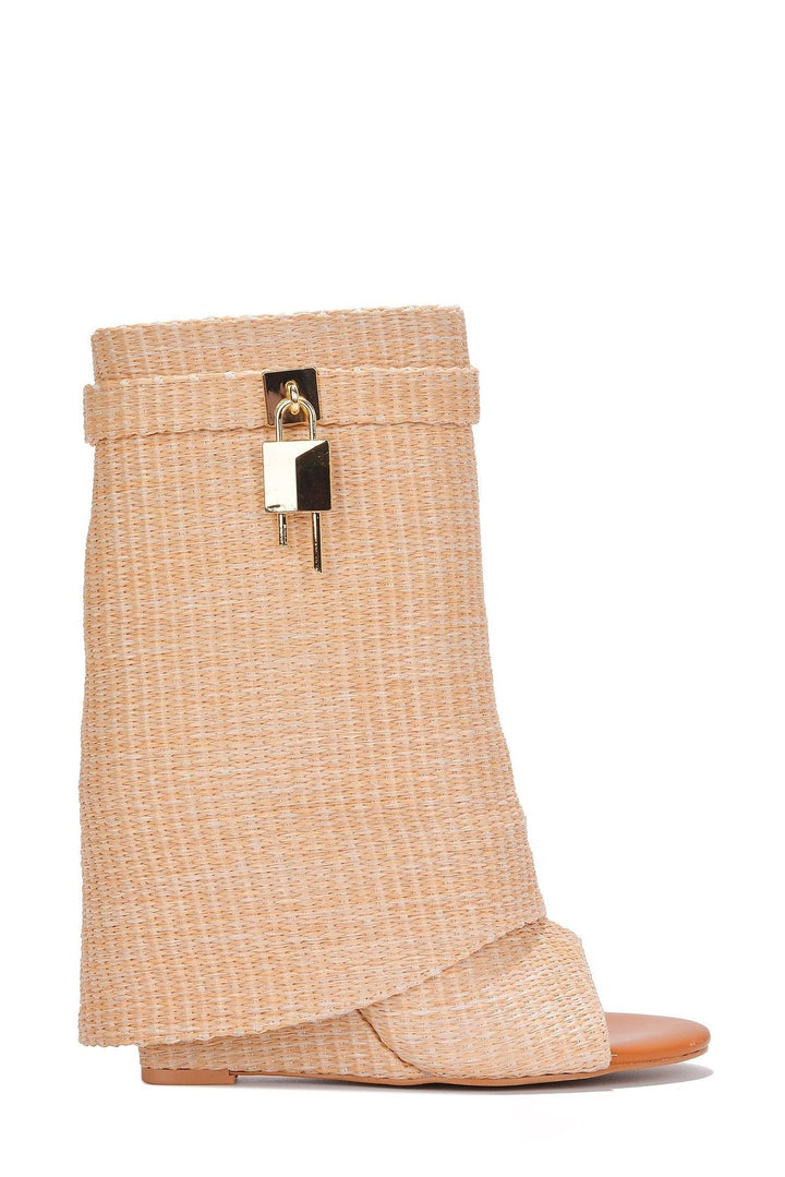 BETTERWORLD - NUDE - WEDGES by CAPE ROBBIN raffia open toe wedge boots round toe zipper closure lock design ankle boots padded insole The Betterworld open toe raffia wedge boots will keep your feet comfortable and stylish at the same time. They feature a round toe with a zipper closure and a lock design for a secure fit. The ankle boots are padded for extra comfort,and the raffia material adds subtle texture and a unique look to your outfit. You'll love the elevated style that these boots provide.