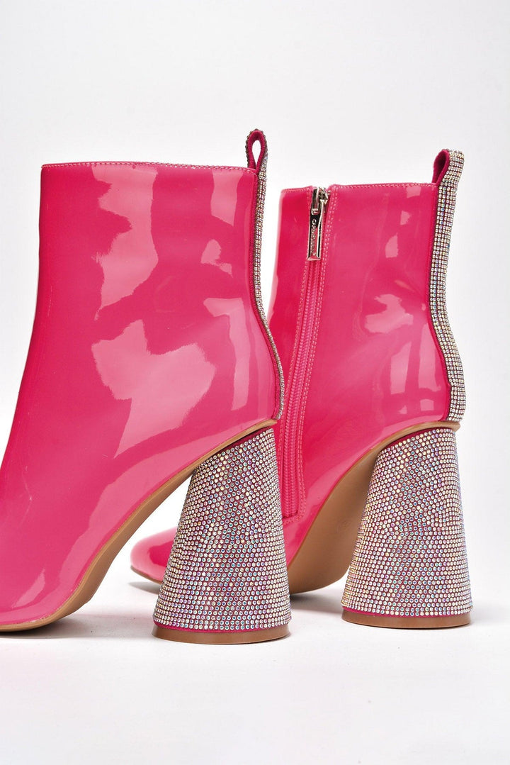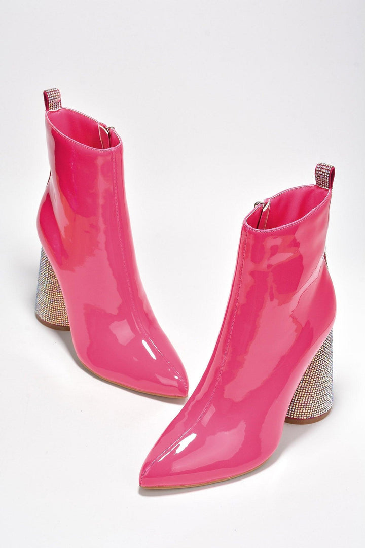 BIBA - PINK - BOOTIES by CAPE ROBBIN ankle boots rhinestone-coated pull tabs and block heel patent finish zipper closure round pointy toe Sparkle and shine in these Biba ankle boots! Featuring a patent finish,these boots will have you turning heads in style. Comes in silver,pink,white,nude,and blue.