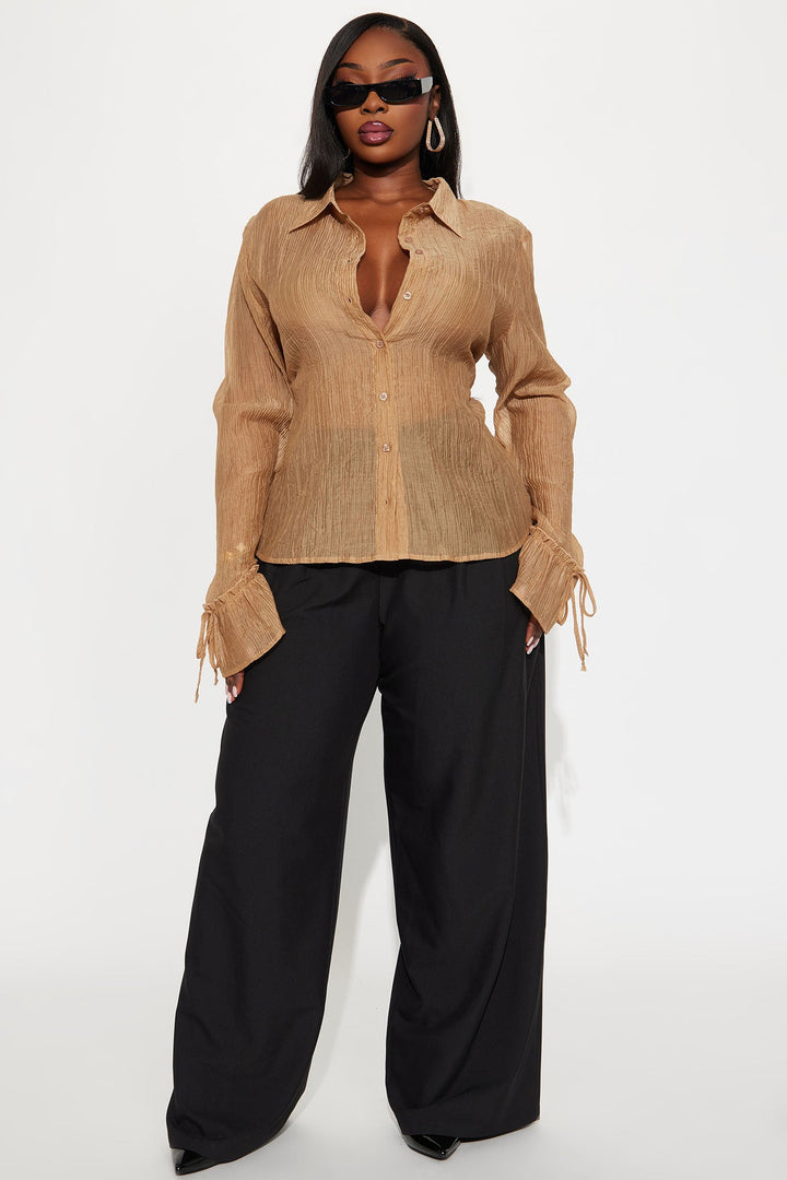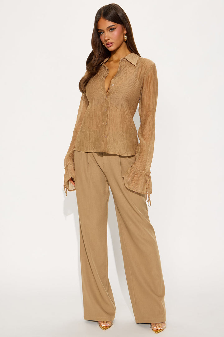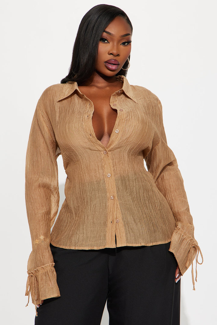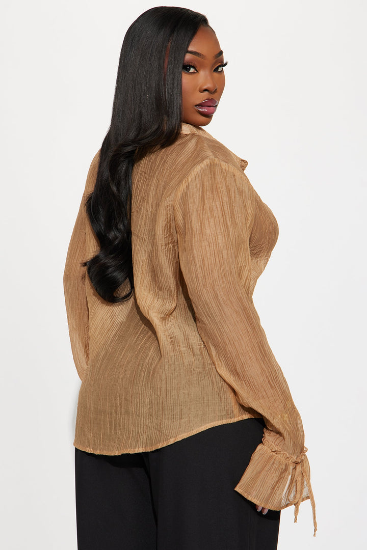 Available In Chocolate And Taupe. | Organza Shirt | Button Up | Plisse Detail | Non Stretch | Self : 100% Polyester | Imported