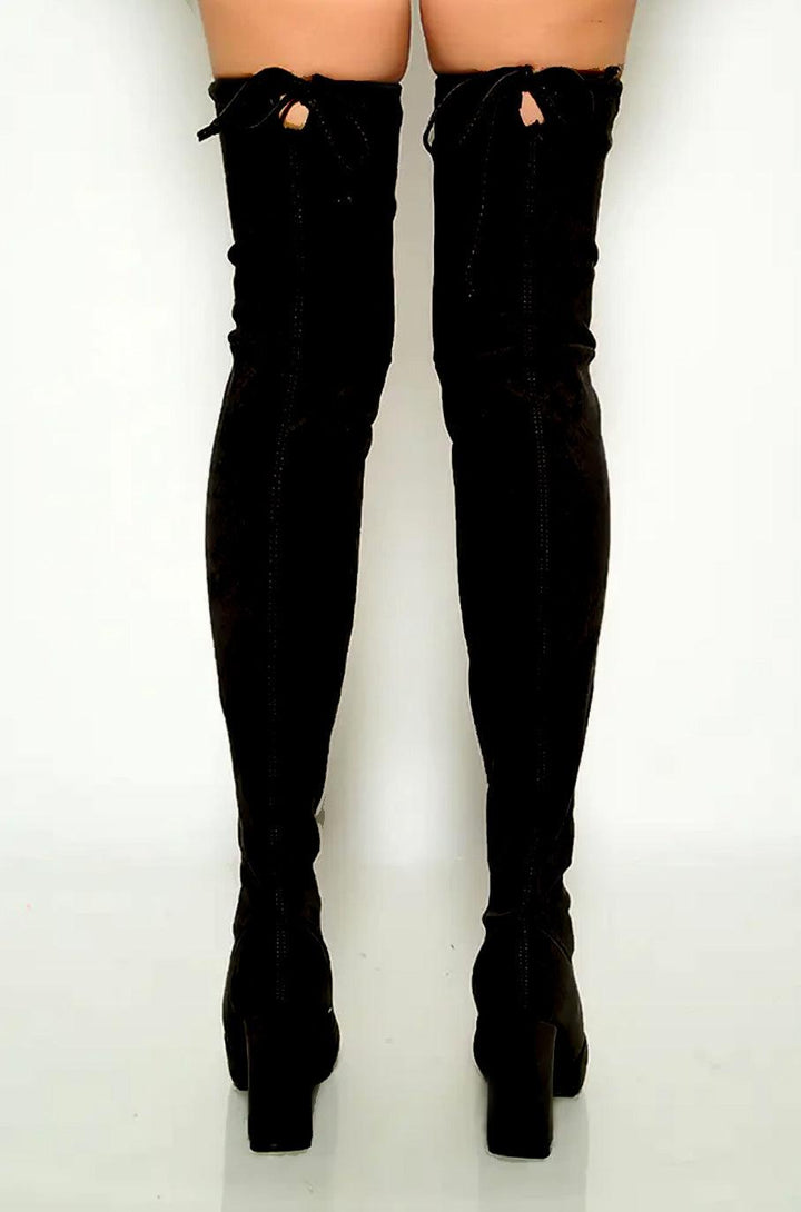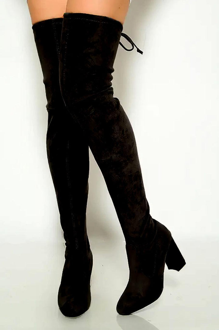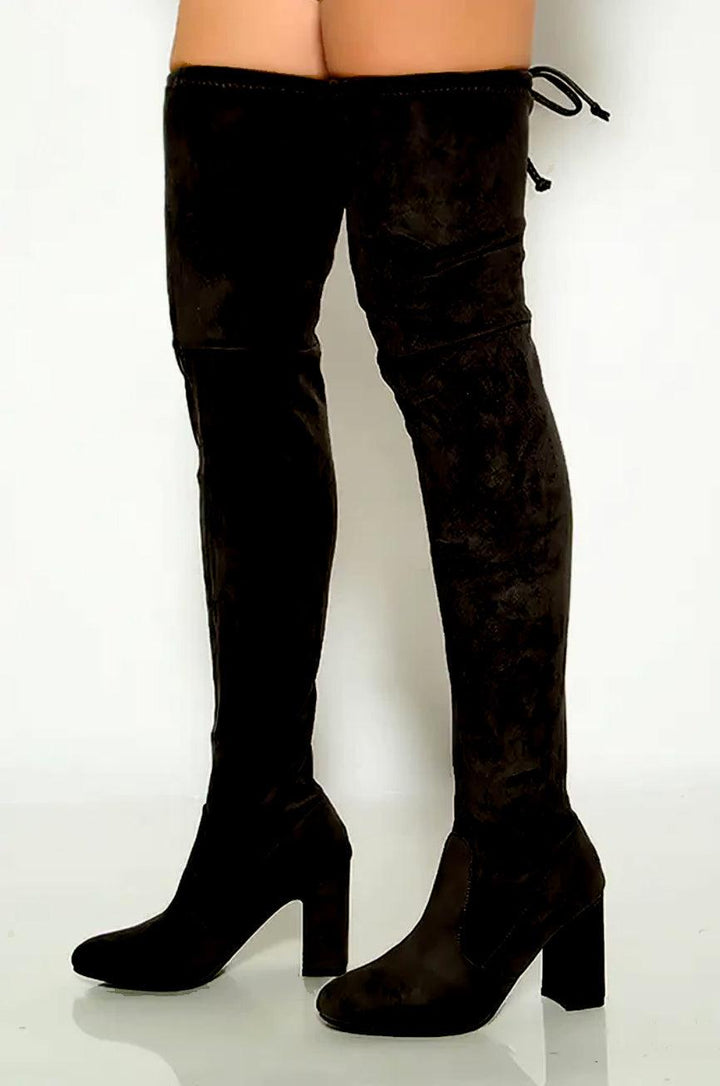 These over knee fashion boots features a comfortable stretchy shaft, back drawstring closure, pull on function, a chunky block mid heel, rounded closed toe and a lightly padded insole. 16 inch Circumference Approximately 4 inch heels