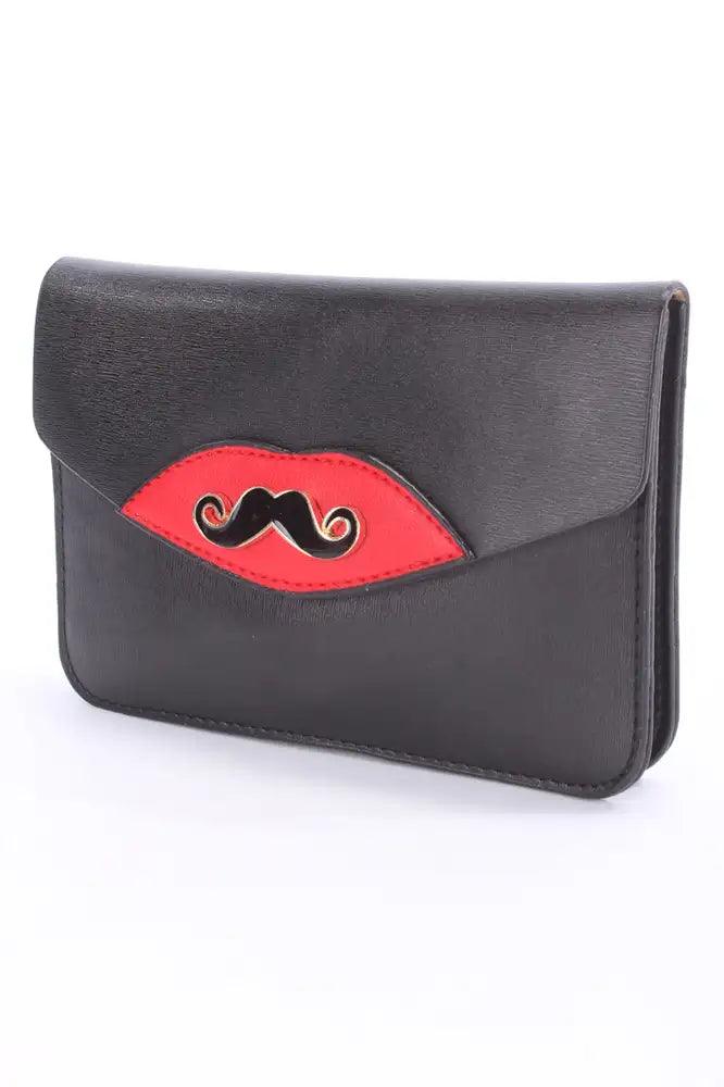 This cute clutch is the perfect piece to head back to school in style! Featuring faux leather, mustache pendant, button closure, followed by removable shoulder strap. 7 inch width, 4 1/2 inch height, 1/2 inch depth.