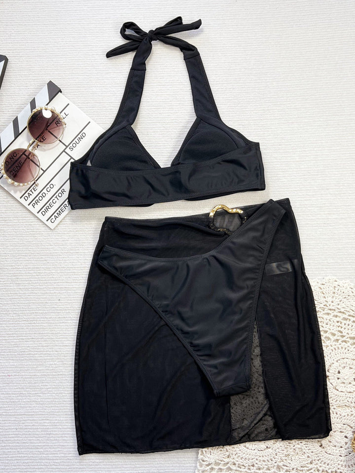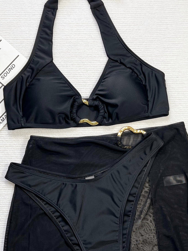 Black Old Decor Halter Padded Mesh Cover-Up Sexy 3Pc Swimsuit Set