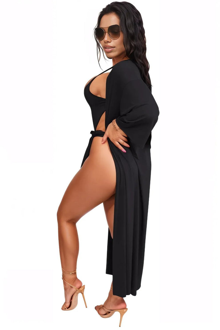 Black Strappy Monokini Kimono Cover-Up 2Pc Swimsuit Set