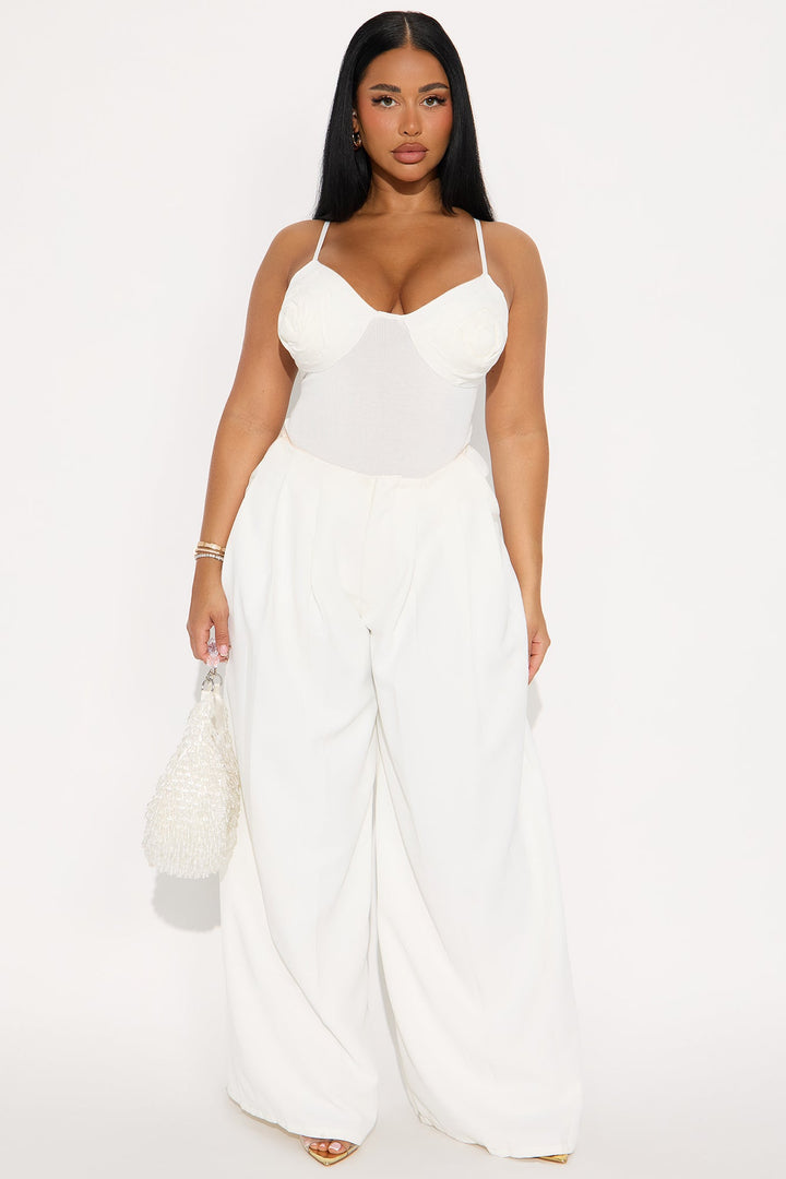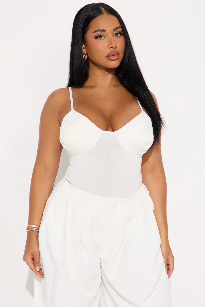 Available In White. | Fina Sale | Bodysuit | V-Neck | Adjustable Strap | 3D Applique | Thong Bottom | Snap Closure | Stretch | Self : 85% Viscose 15% Polyester | Imported