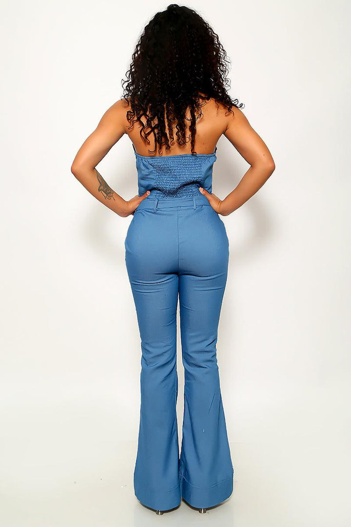 Blue Denim Halter Smocked Back Fitted Bell Bottom Sexy Jumpsuit