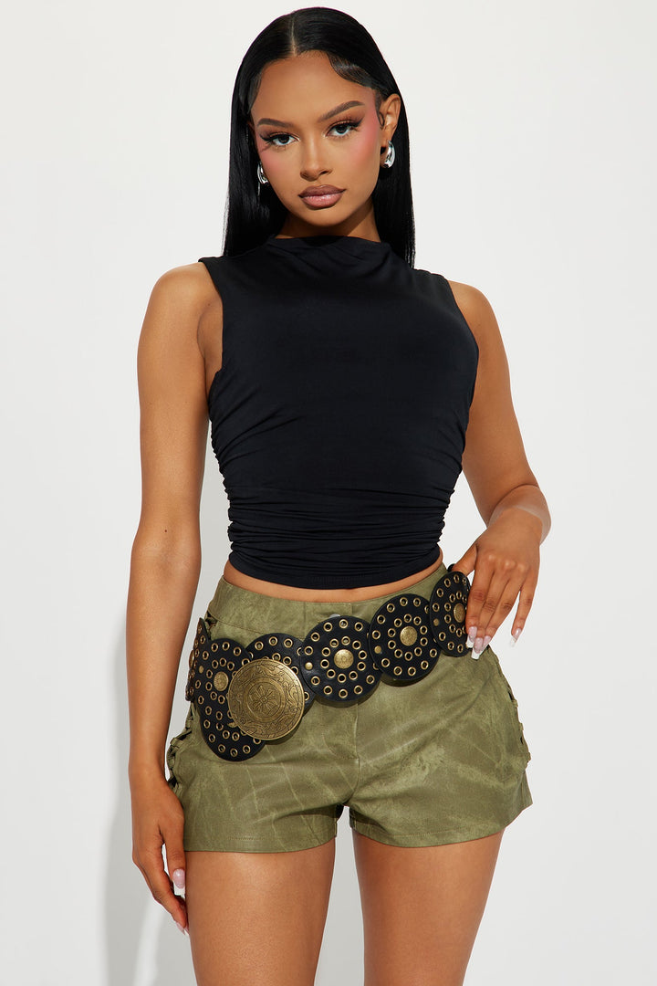 Available In Black. | Faux Leather Belt | Adjustable | Eyelet Design Detail | Metal Disk Detail | Length: 50" | Imported