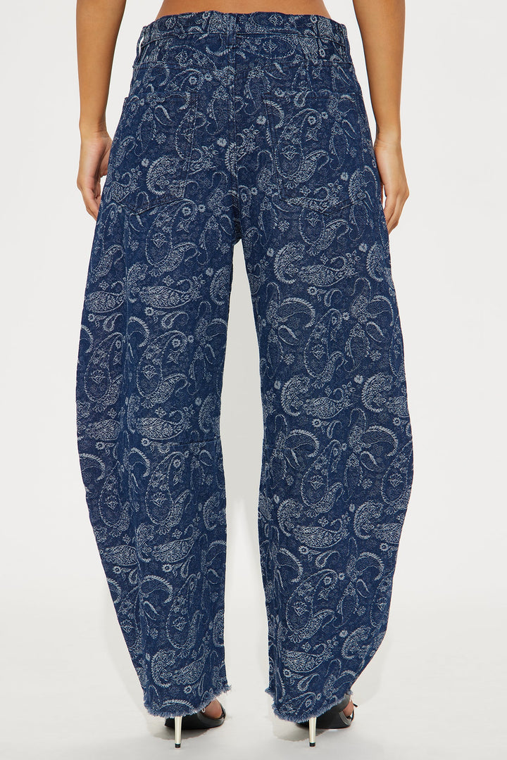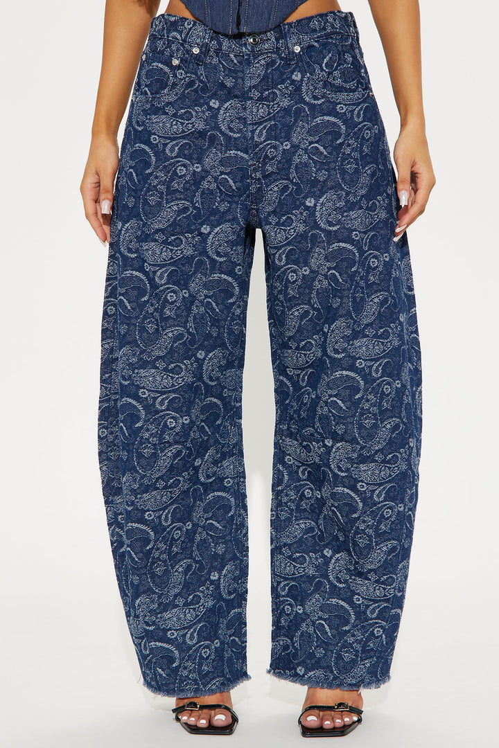 Available In Dark Wash. | Barrel Leg Jean | 5 Pocket | All Over Paisley Pattern | Fray Hem | 12" Rise | 27" Inseam | 90% Cotton 10% Polyester | Non Stretch | Imported
