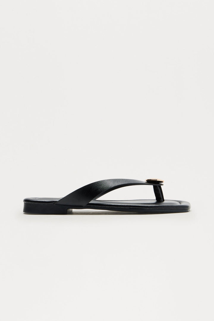 Available In Black, Brown, Multi Color And White. | Flat Sandals | Flip Flops | Hardware Detail | Square Toe | Flat Heel | Imported
