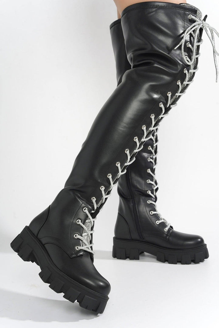 BOXI - BLACK - BOOTS by CAPE ROBBIN round toe lug platform thigh-high boots rhinestone-embellished PU lace up These stunning thigh-high boots are next level. The 20-hole lace-up beauties are snug and will glimmer under dazzling lights. Available in black or nude.
